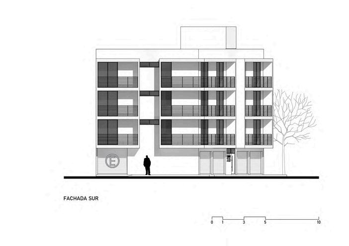 The project was solved with cantilevered balconies and a mobile metal lattice on the facade, allowing the control of east and south sunlight towards the interior of the apartments, resulting in a dynamic building throughout the day.