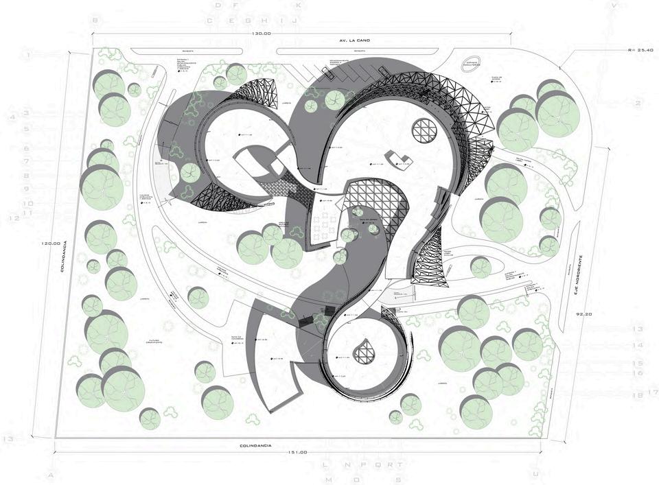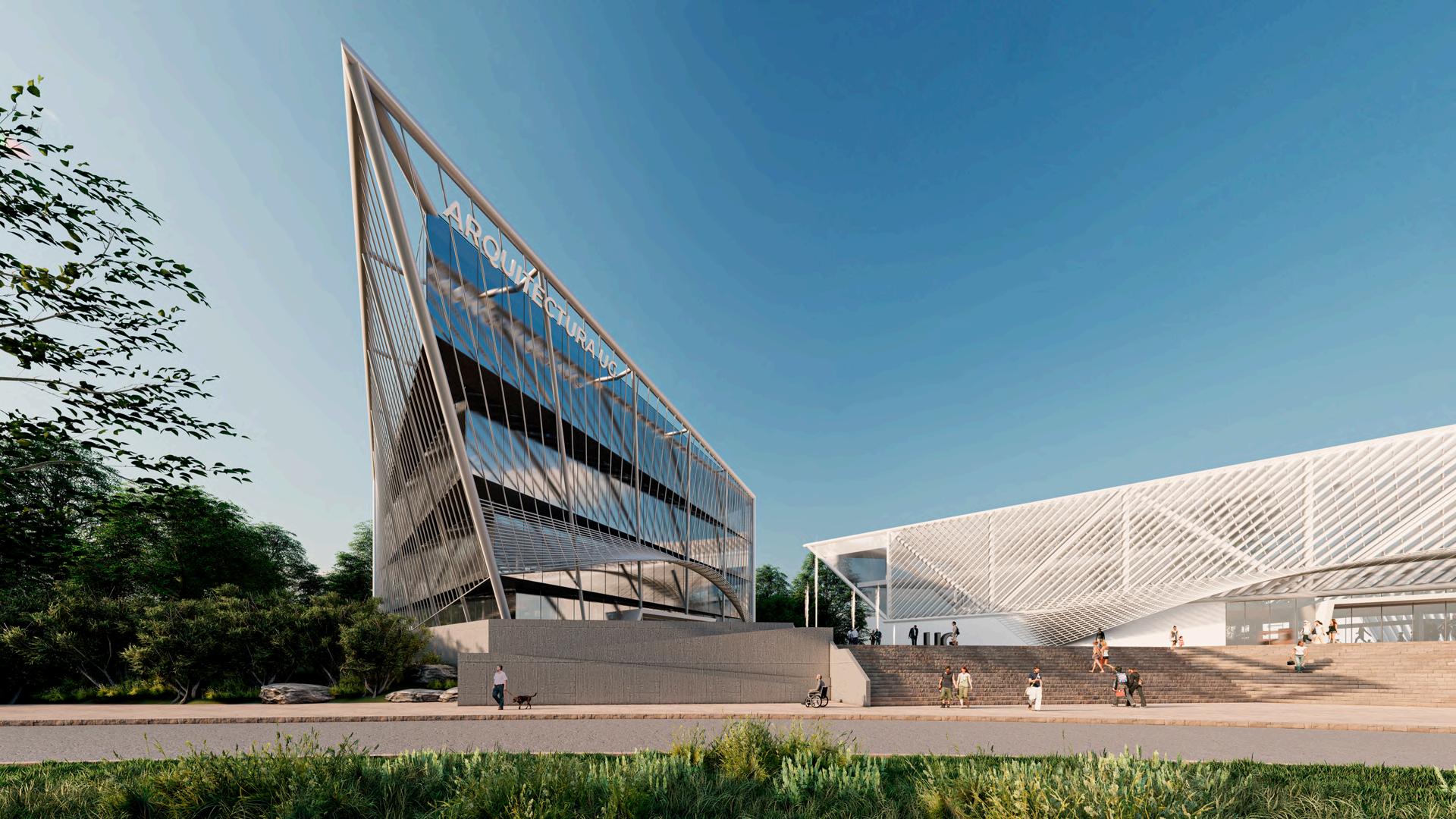 The set of buildings is made up of an administrative building, a building for complementary spaces, a building for theory classrooms, two buildings for drawing workshops, and a building for laboratories. The morphology in the design is meant to reflect the intrinsic value of architecture with bold, disruptive, and striking shapes that generate very characteristic design elements such as the warped louvered brise-soleil structure in the classroom buildings.