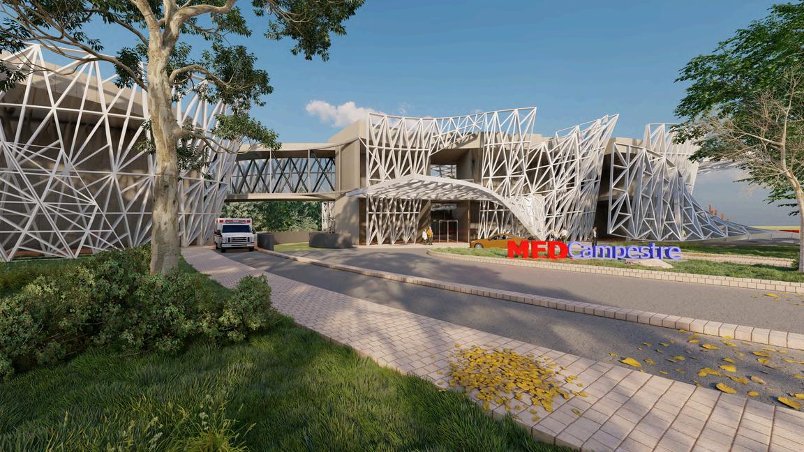 MED Campestre is a private health center offering basic medical services, it is located in the city of Celaya, Guanajuato. The concept of the design starts from the abstraction of the ouroboros, which represents the cyclical nature of things and earthly life, this concept becomes in elements integrated into the terrain, torsion of exostructures and a parametric covering skin that responds to natural conditions such as sunlight and winds, resulting in a dynamic and constantly changing morphology. The design and functionality allows solving problems of current viral risks.