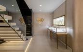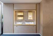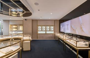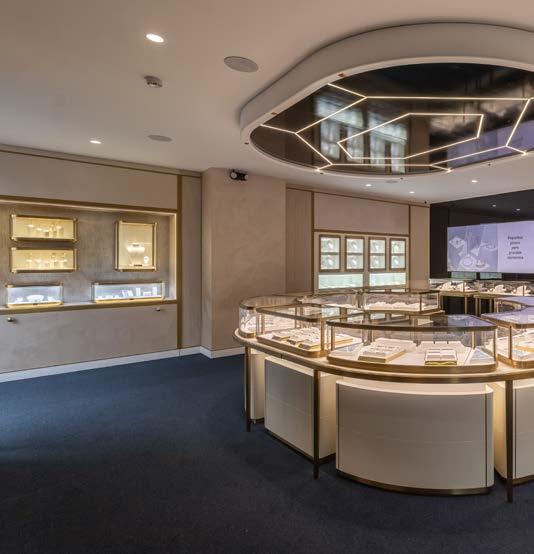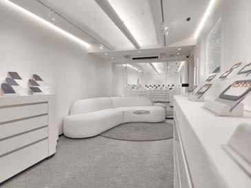 “En el corazón del salón de ventas, el circuito definido por un mueble escalonado en tres niveles guía al cliente en un recorrido pensado para que cada joya se contemple en su máxima expresión. Este diseño, integrado a las paredes y con terminaciones suaves, organiza el flujo del espacio mientras preserva su armonía visual”, dice Carlos Manuel.
