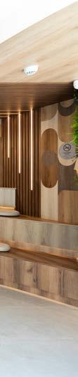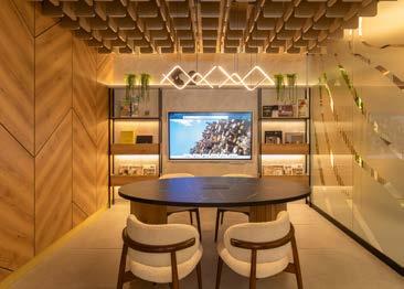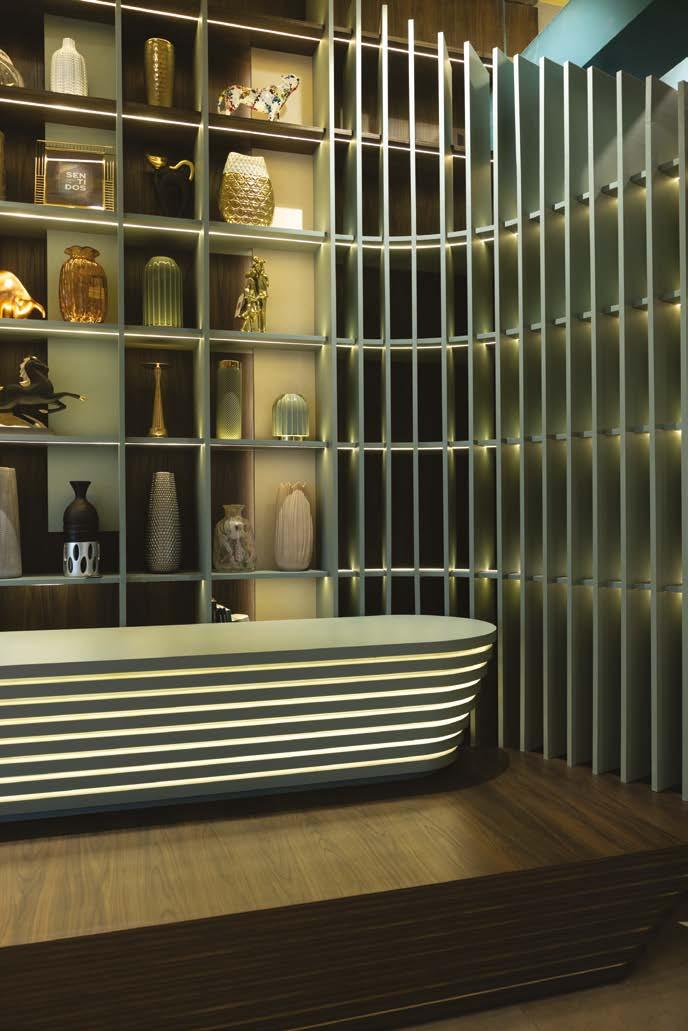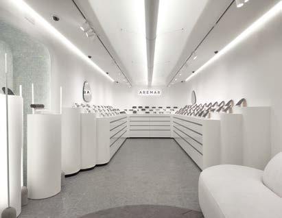 “La vitrina principal se erige como una pieza central en el salón, revestida con pepelma iridiscente que captura y refleja la luz creando un efecto de brillo y movimiento que evoca la misma esencia de las joyas exhibidas. Este elemento no solo aporta dinamismo al diseño, sino que también refuerza la atmósfera de exclusividad que caracteriza a Aremar”, agrega el diseñador.