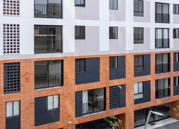 Otro aspecto interesante es que las fachadas, bastante estéticas, combinan elementos de concreto expuesto, enchape de ladrillo y un tratamiento de muros en tonos grises. “Han sido diseñadas con un lenguaje moderno y sobrio para poder destacar como hito urbano. La singular forma del terreno, además, permitió que todos los ambientes principales de los departamentos tengan una correcta ventilación e iluminación, asegurando confort térmico y eficiencia energética”, explica el arquitecto.