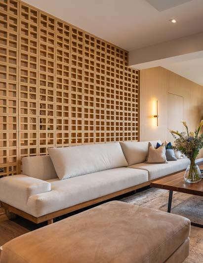 Un punto clave del diseño fue la celosía de madera que domina la zona social, hecha con 140 piezas trabajadas artesanalmente. “No queríamos la típica celosía con listones grandes sino crear una distinta, menos pesada pero más creativa, a base de cuadrados de madera que fueron puestos uno por uno”, comentan Luis y Gianmario.
