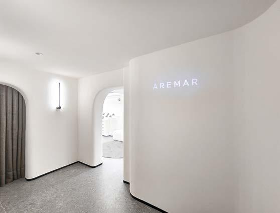 Al ingresar, los clientes son recibidos por un espacio con formas curvas y texturas rugosas pero refinadas, donde la proyección sutil del logo de Aremar en las paredes agrega un toque de modernidad. Este detalle, poco convencional en una joyería, establece desde el principio la identidad única del espacio.