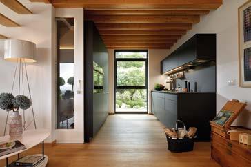 LA COCINA FUE CLAVE PARA LOGRAR CALIDEZ EN ESTE AMBIENTE GRANDE CON TANTO VIDRIO Y CEMENTO PULIDO. “PROCURAMOS QUE EL EQUIPAMIENTO INCLUYA EL USO DE MADERA, TANTO EN LOS GABINETES COMO EN LA MESA DE COMEDOR”, DICEN LOS ARQUITECTOS MOGOLLÓN Y RAMÍREZ. UNA SALA HUNDIDA (FOTOS IZQUIERDA E INFERIOR) PERMITE A TODOS APRECIAR LA MONTAÑA EN SU TOTALIDAD.