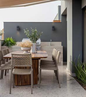 “Adicionalmente, la clienta nos pidió un jardín de flores y plantas y una pequeña pérgola o lugar para pasar una tarde en la punta extrema del departamento. Para ello, habilitamos un área con parrilla para compartir con amigos y otra zona de descanso con vista al mar. En ambas losas, que se integran al jardín con un acabado de terrazo en formato grande, colocamos muebles giratorios para lograr una vista de 180 grados”, comenta D’Angelo.