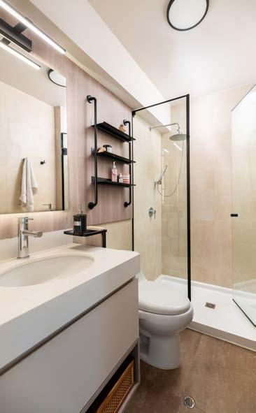 Los accesorios metálicos negro mate aportan elegancia y destacan en el espacio. “Las luminarias sofisticadas, finalmente, le dieron a este baño el realce que merecía”, concluye la responsable de Asmat Studio.