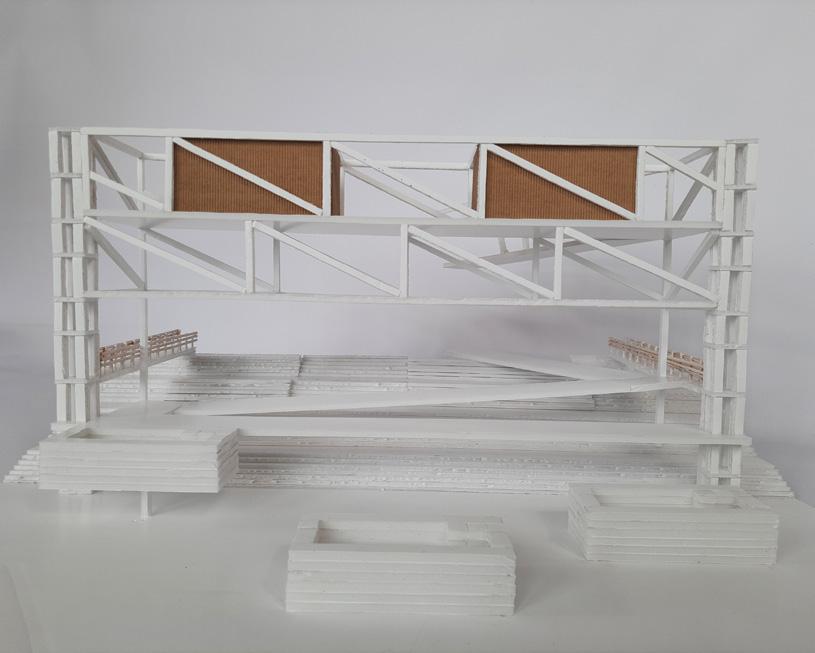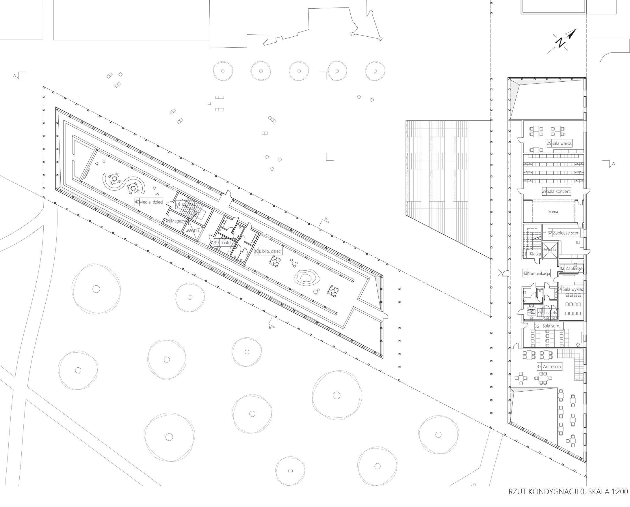Projekt składa się z dwóch części, połączonych na poziomie -1. Pierwsza część obejmuje sale warsztatowe, wykładowe, mieszkania dla instruktorów, salę koncertową oraz restaurację.