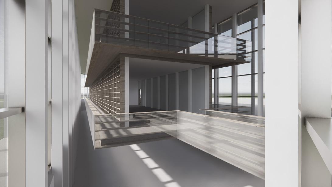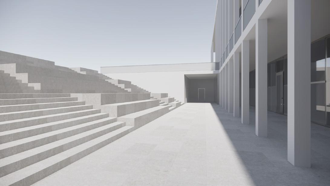 Podziemne połączenie obu części zaprojektowano jako przestrzeń wystawową, której eksponaty można oglądać również z poziomu parteru dzięki szklanej podłodze. Charakterystycznym elementem projektu są także szerokie schody zewnętrzne, które służą jako miejsce spotkań i odpoczynku.