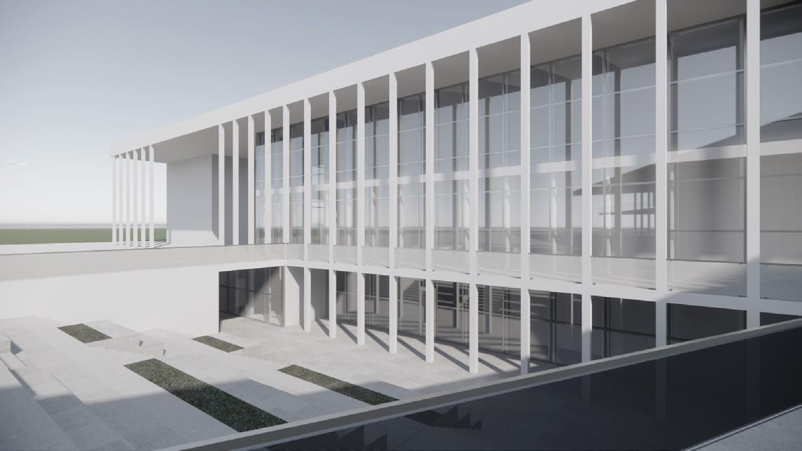 Szklana fasada oraz obła forma budynku sprawiają, że bryła jest delikatna i harmonijnie wpisuje się w otoczenie.