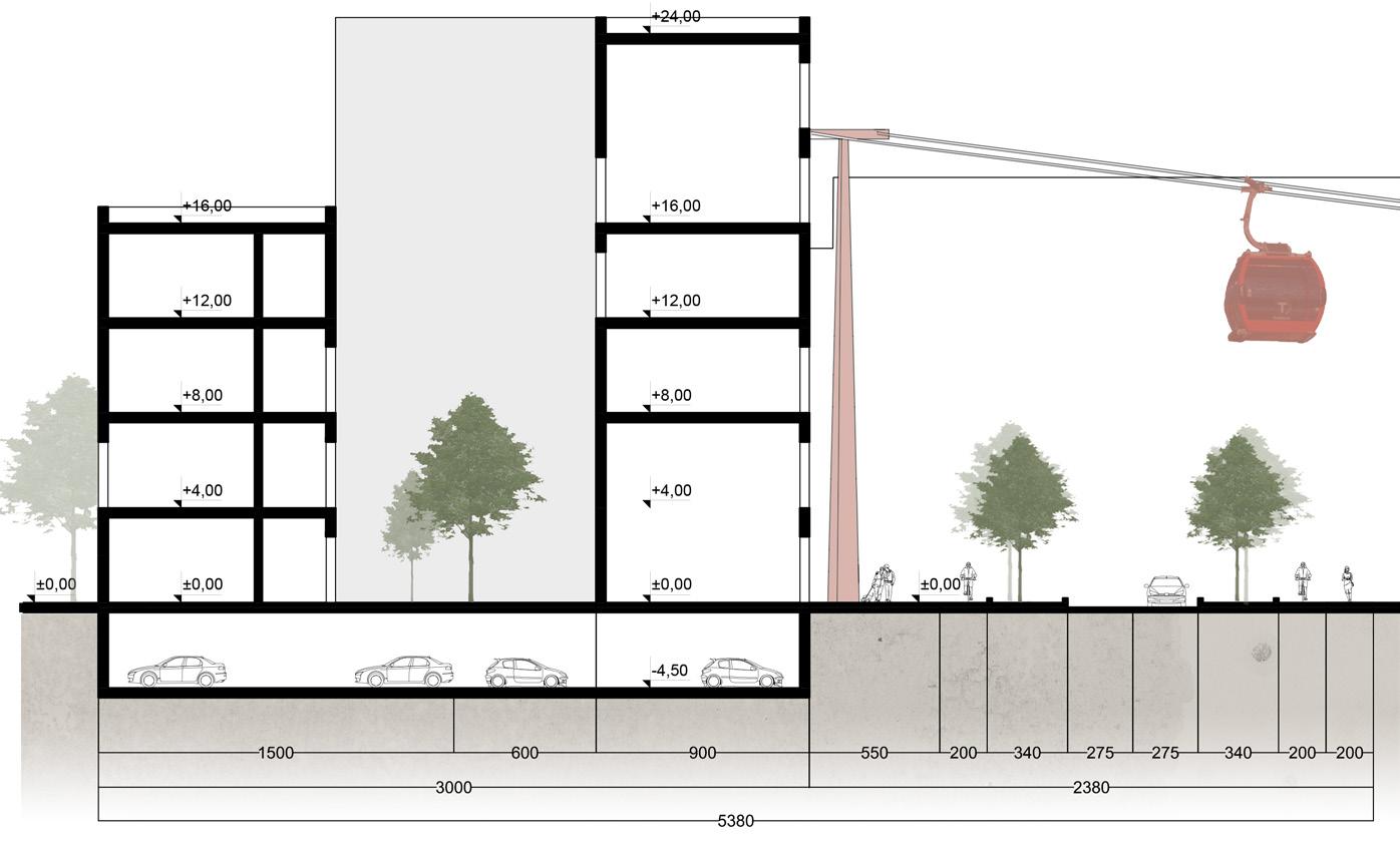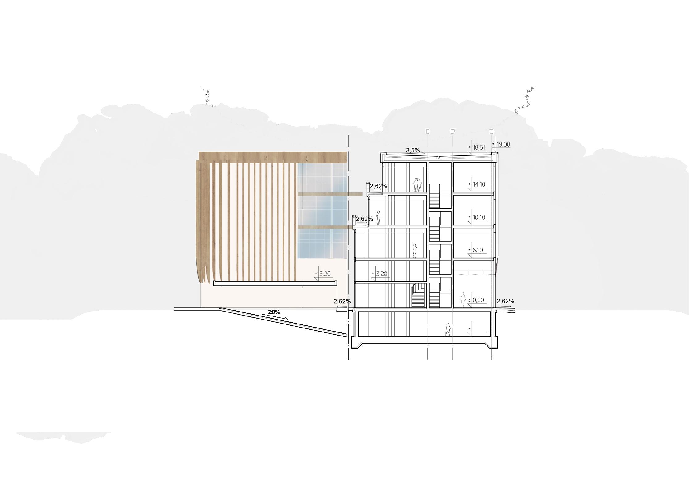 Kaskadowa forma budynku, uzyskana przez wycofanie górnych kondygnacji, tworzy tarasy widokowe i rekreacyjne z zielenią, które integrują budynek z otoczeniem i służą jako miejsca spotkań.