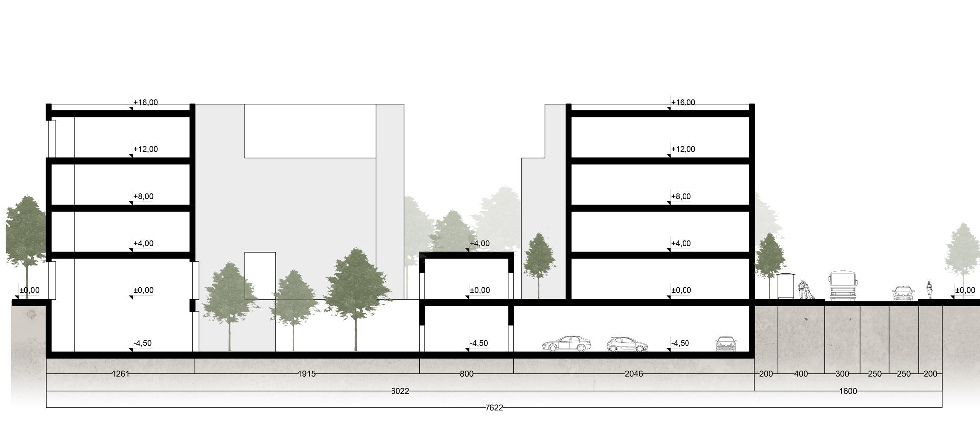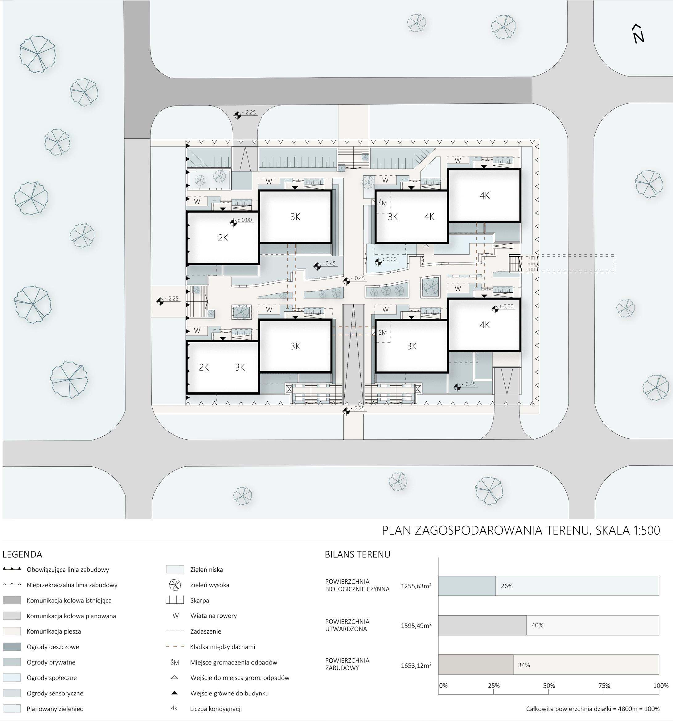 Projekt zawiera także szereg rozwiązań proekologicznych, takich jak: systemy irygacyjne, zbiorniki na wodę szarą i deszczową, rekuperacja, ogrody deszczowe oraz przesłony okienne zapewniające termoregulację.