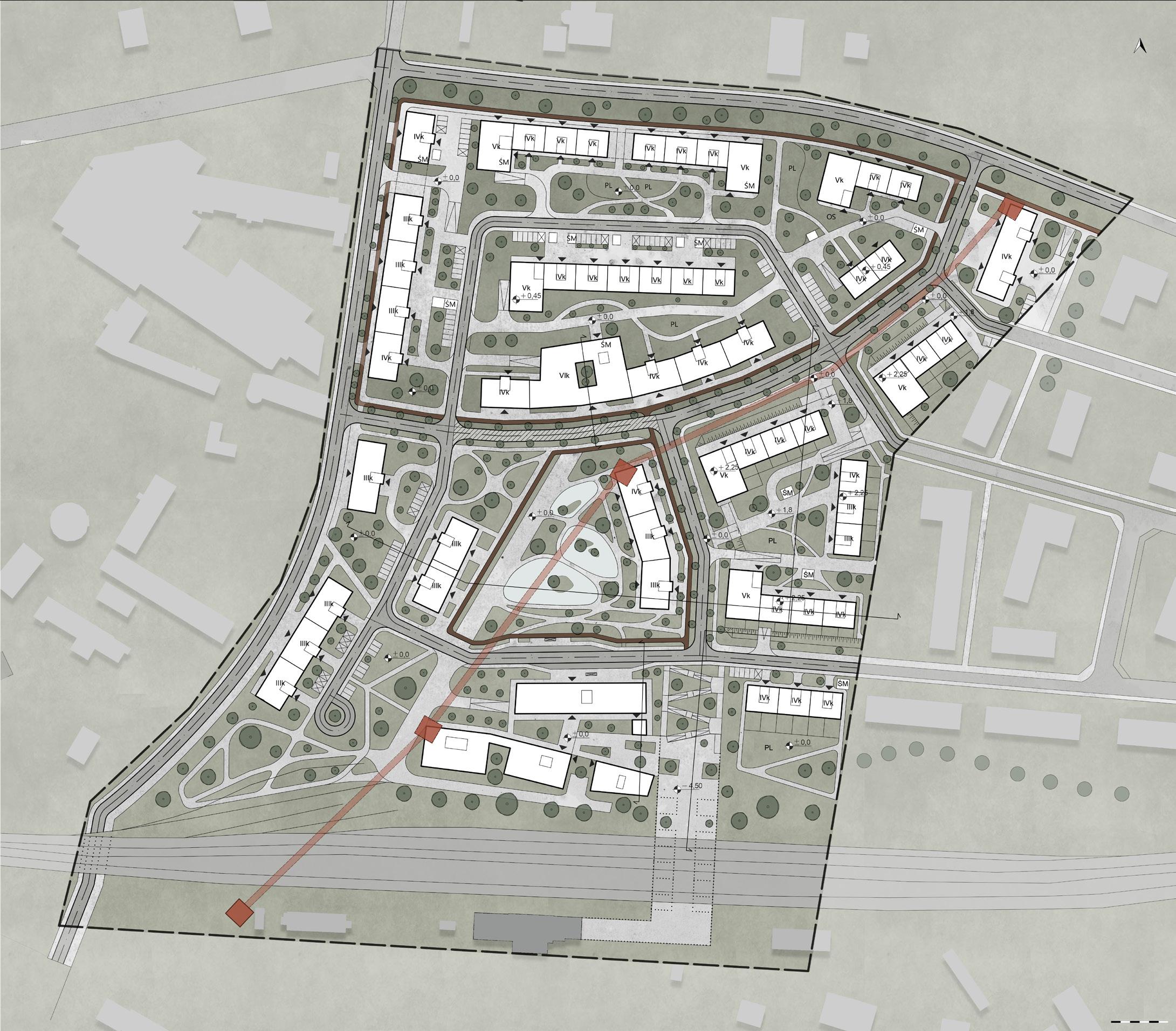 Głównym założeniem projektowym było przedłużenie osi kompozycyjnej biegnącej z Rynku i zakończenie jej dominantą wysokościową w centrum osiedla.