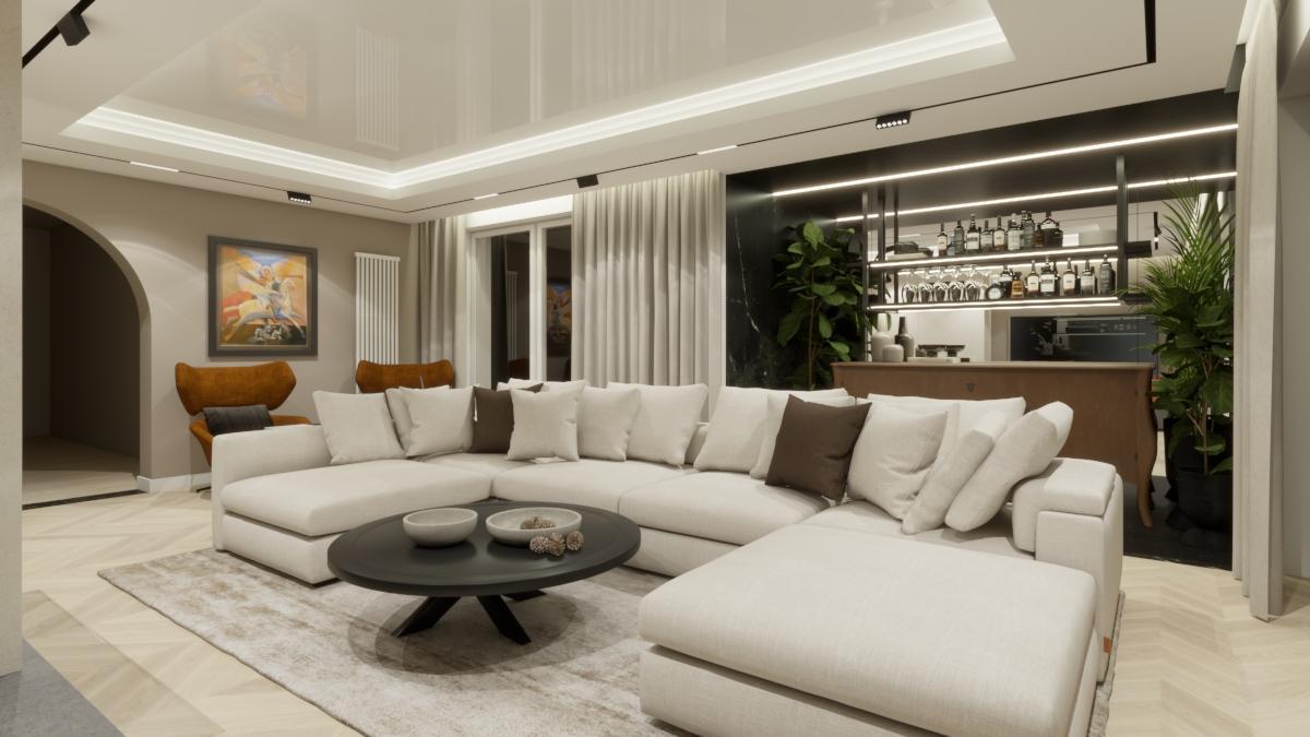 Wnętrze utrzymanewjasnejkolorystyce, główniew bieliorazwróżnychodcieniachszarościprzełamane złotymi akcentami. Stylistyka wnętrza łączy ze sobą nowoczesność z elementami glamour. Całość stonowanego wnętrza została przełamana nietuzinkowymilampami,tapetamizdomieszkąbarw różuifioletuorazpłytkamizniejednolitąfakturą.