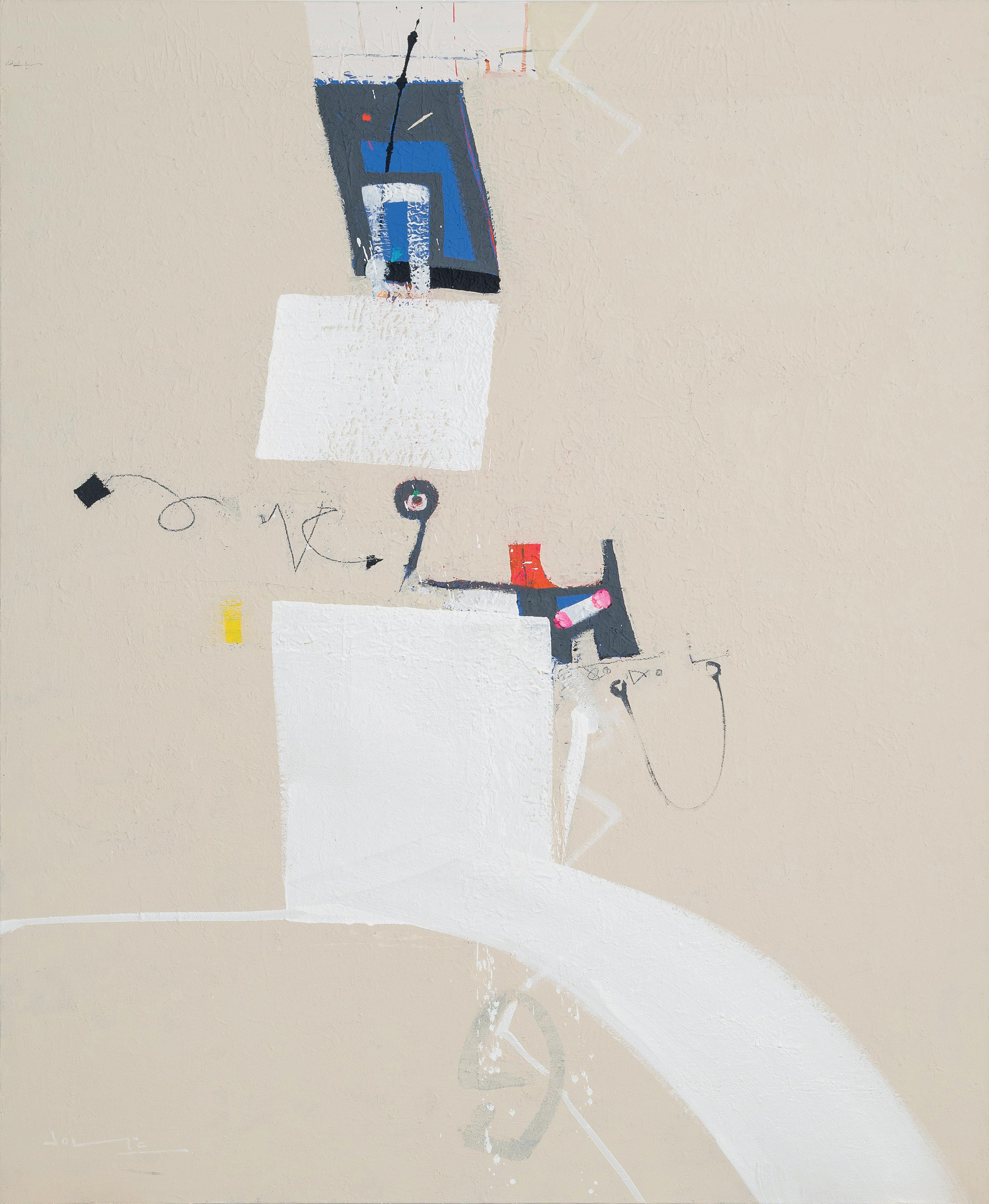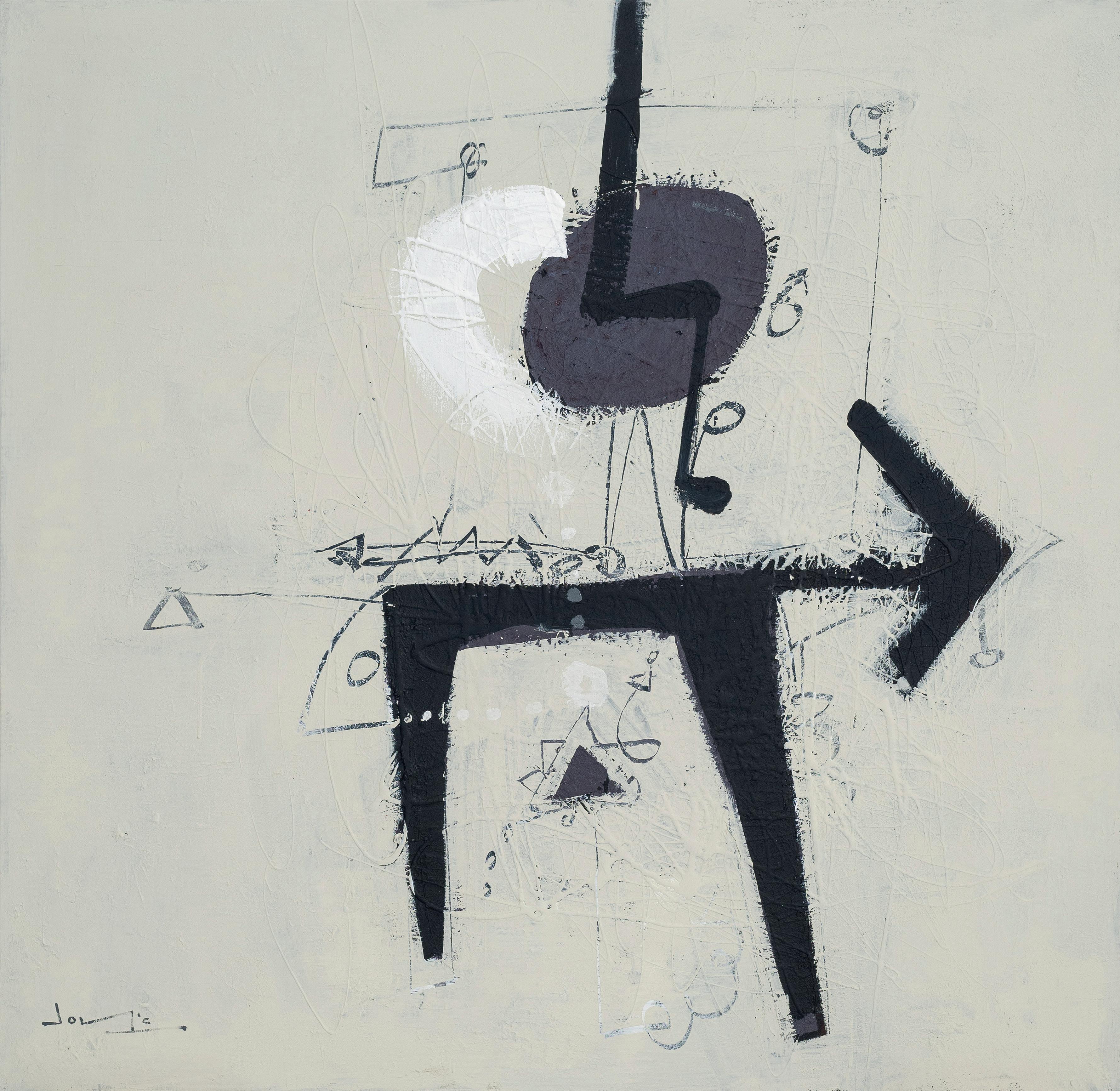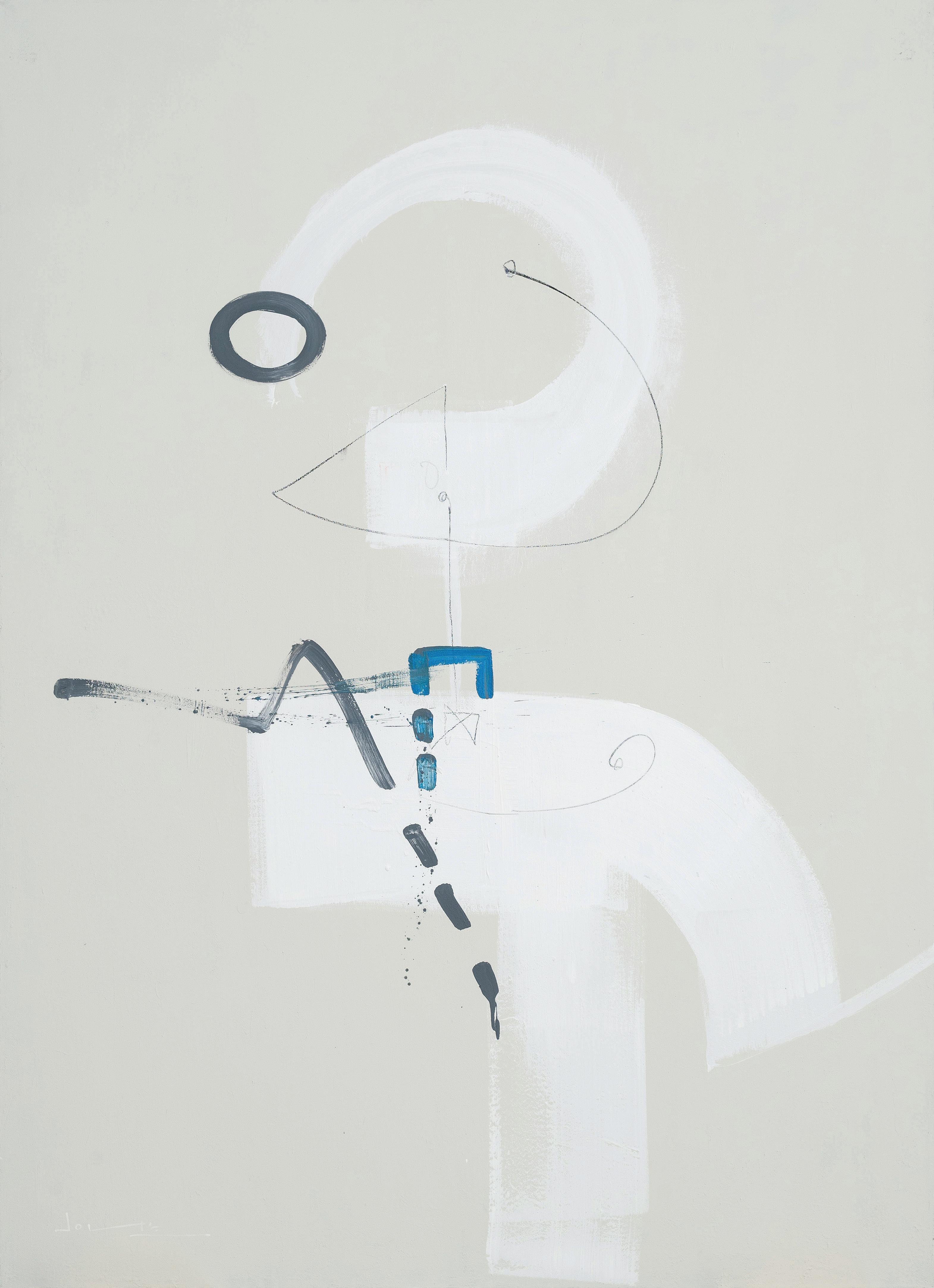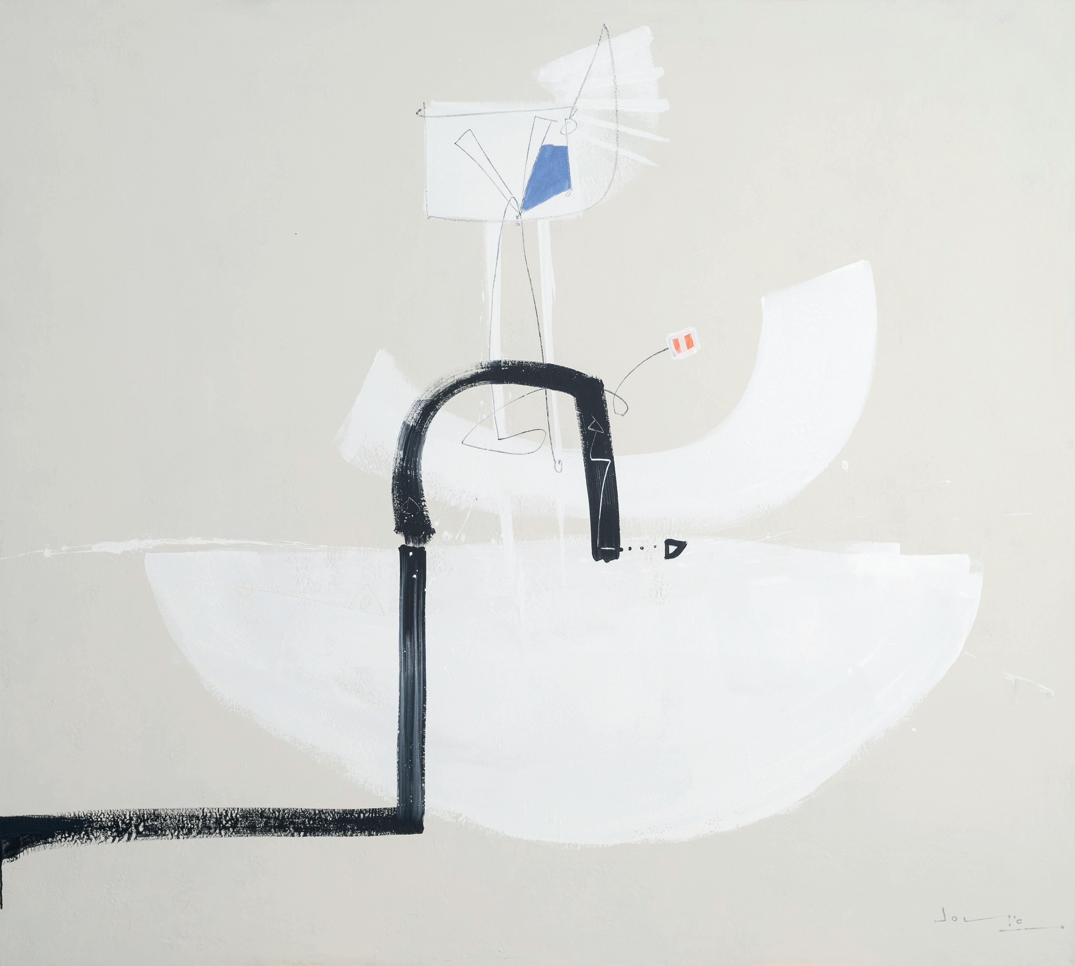 In the works of art of the latest period of painting lasting from 2008 to 2009, Jovic is more and more reducing the formal structure of a painting, together with its formative elements, according to the principle of the logical, expected and consistent way of development. The reduced shapes which are now correlating with each other implicitly include the reduction of the local colour. Generally speaking, the radical reduction of all expressive means of a language is inherent in these paintings. Jovic reduces the local colour to the almost bi–chromatic relationships between the achromatic tints of white and black colour. The cleaning is sometimes carried out to the verges of a minimalist shaping: two or three reduced figures, freely treated shapes, often mildly, expressively deformed.