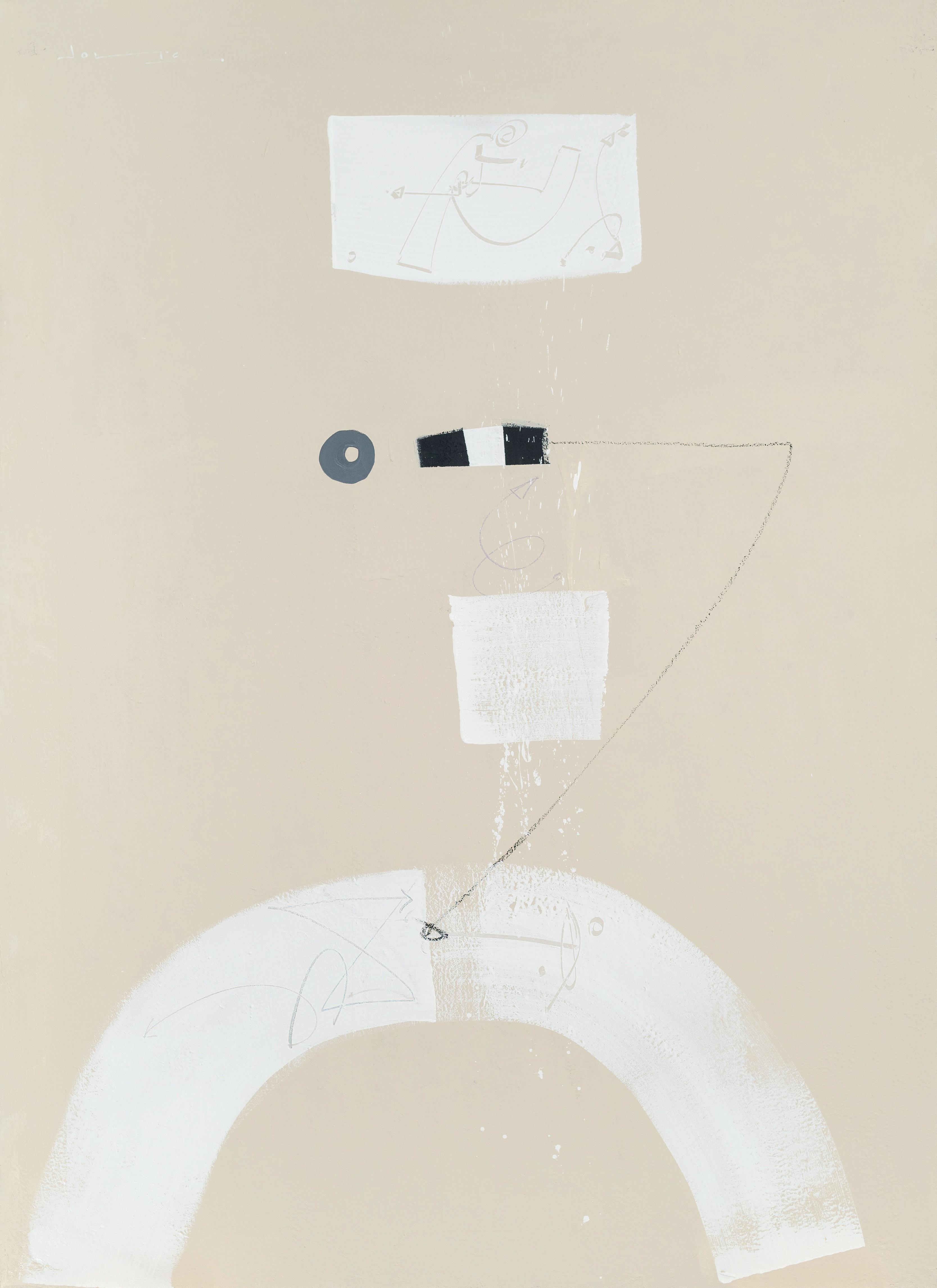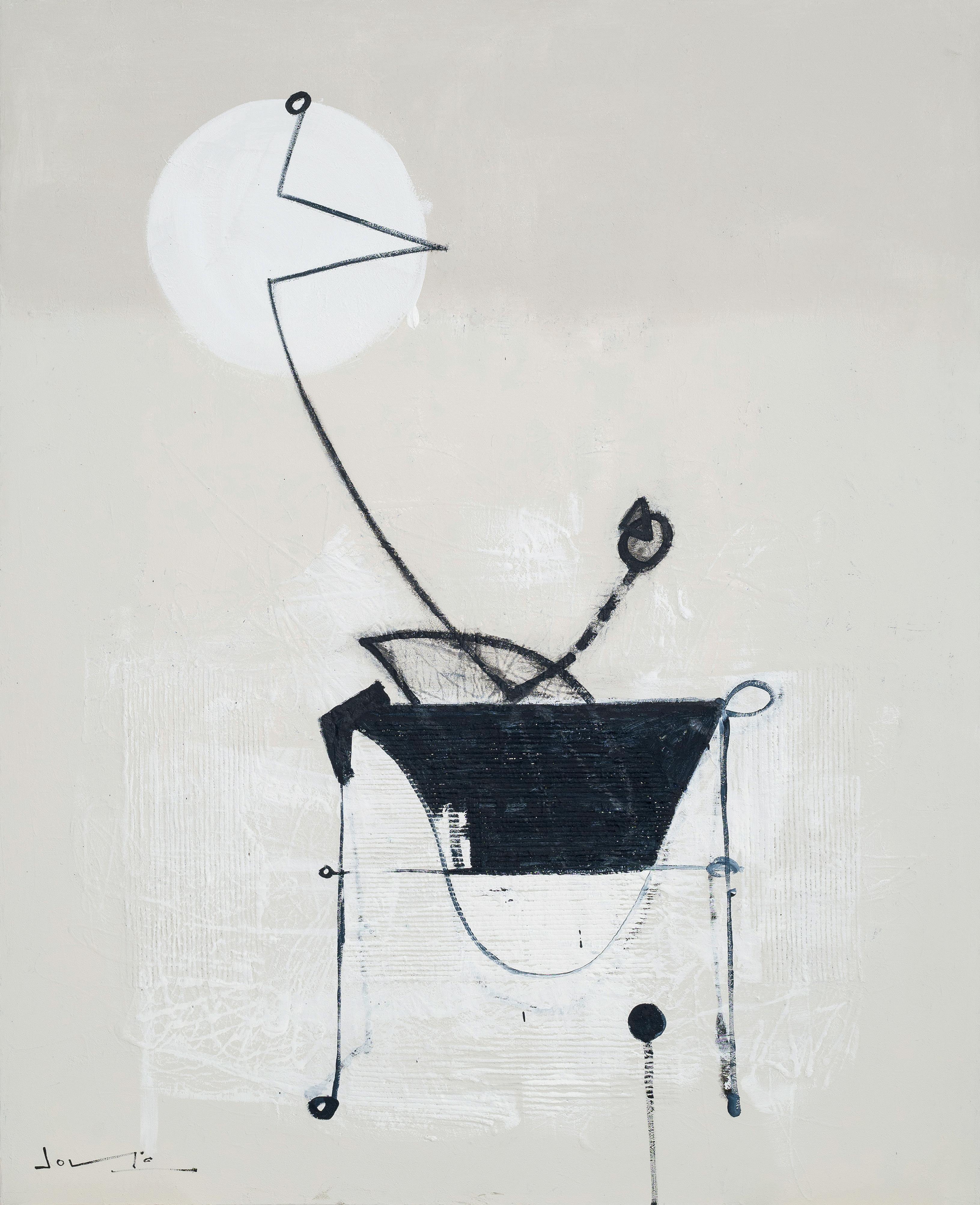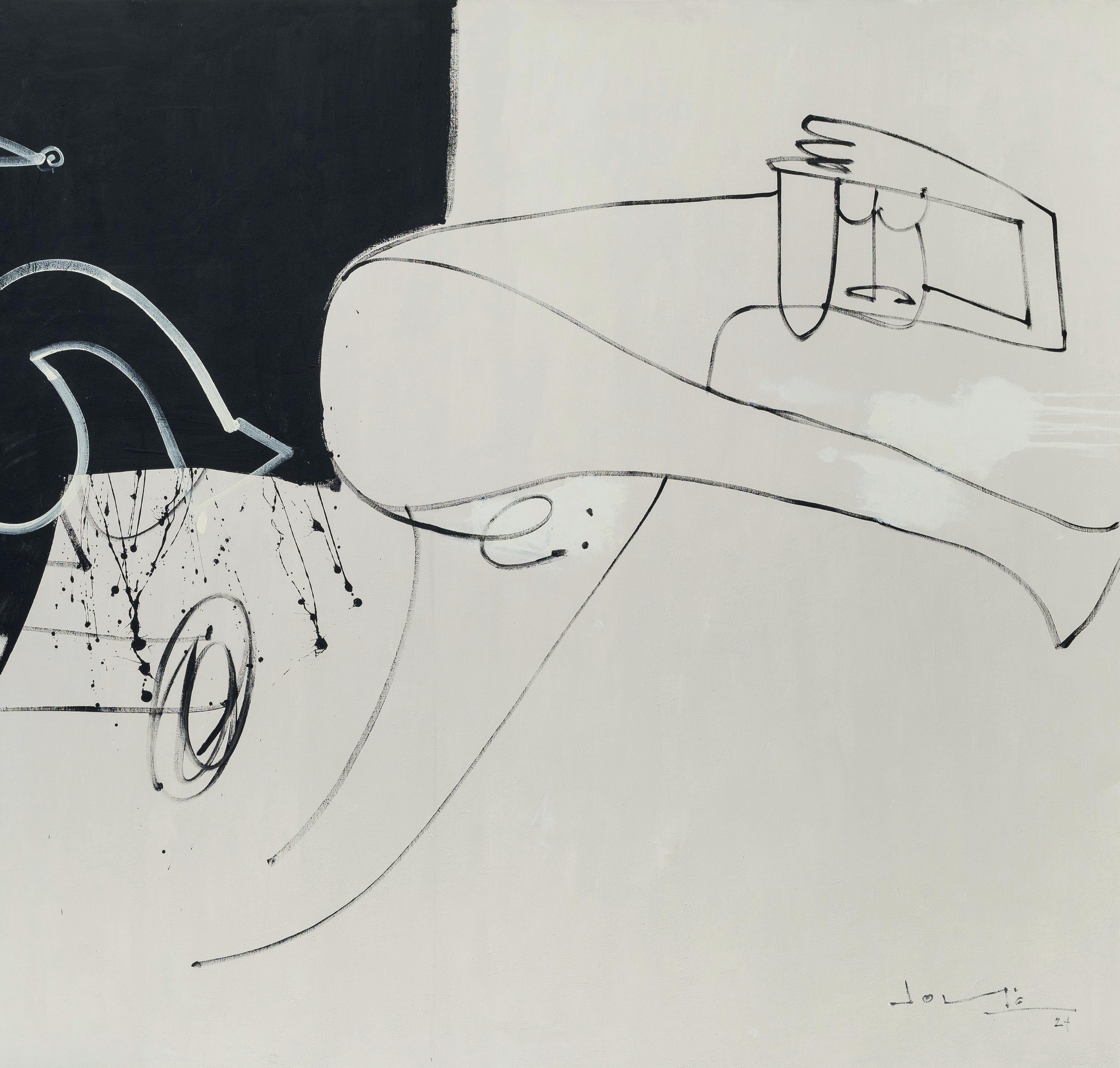 In the works of art of the latest period of painting lasting from 2008 to 2009, Jovic is more and more reducing the formal structure of a painting, together with its formative elements, according to the principle of the logical, expected and consistent way of development. The reduced shapes which are now correlating with each other implicitly include the reduction of the local colour. Generally speaking, the radical reduction of all expressive means of a language is inherent in these paintings. Jovic reduces the local colour to the almost bi–chromatic relationships between the achromatic tints of white and black colour. The cleaning is sometimes carried out to the verges of a minimalist shaping: two or three reduced figures, freely treated shapes, often mildly, expressively deformed.