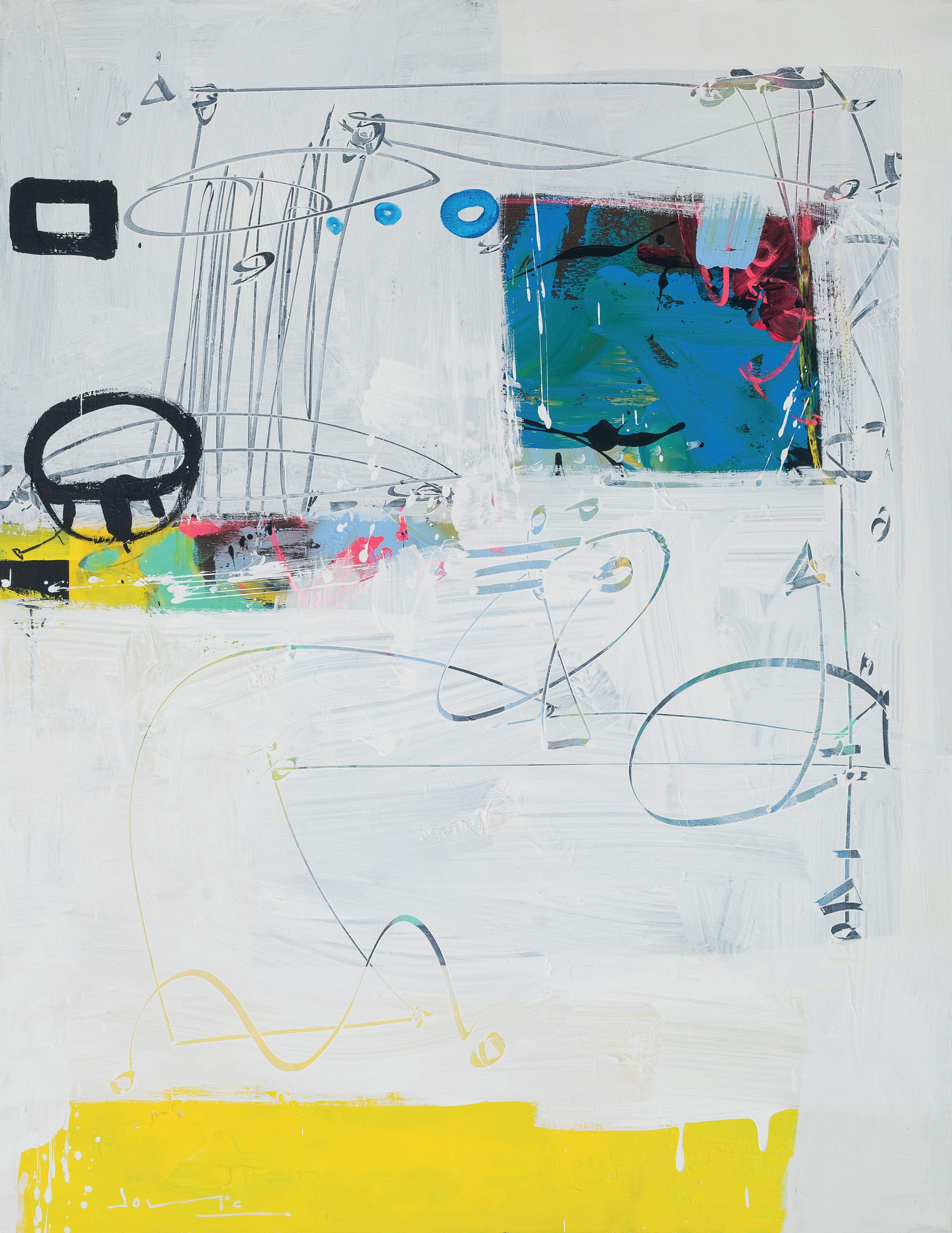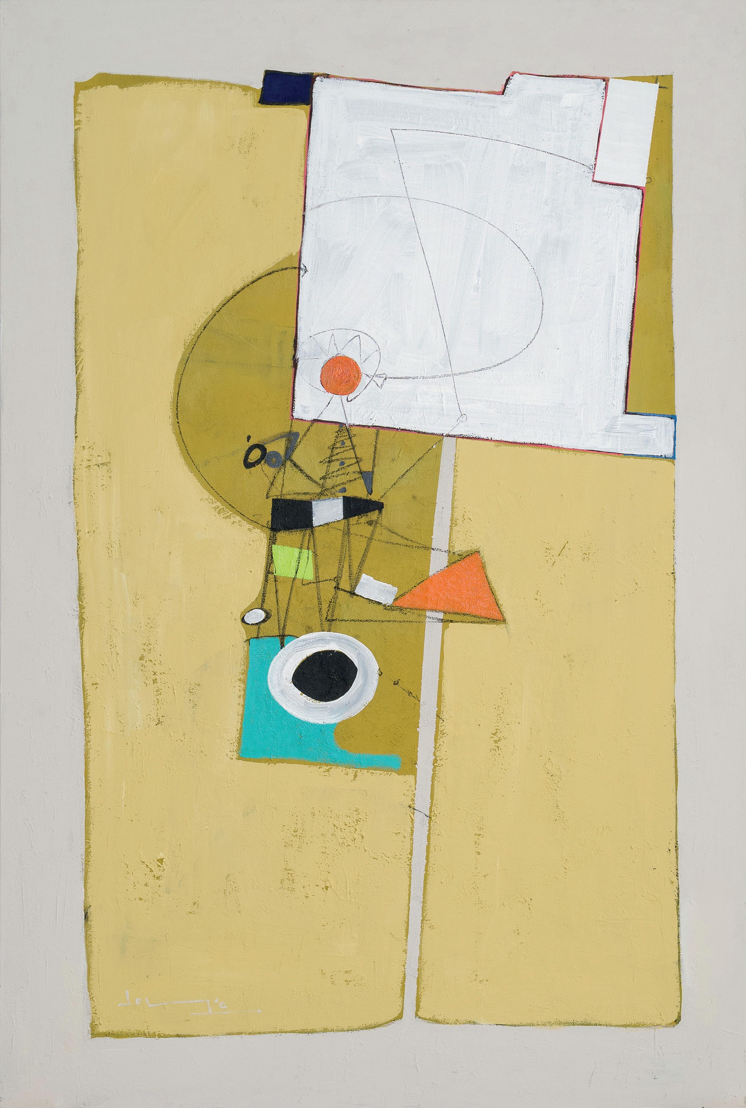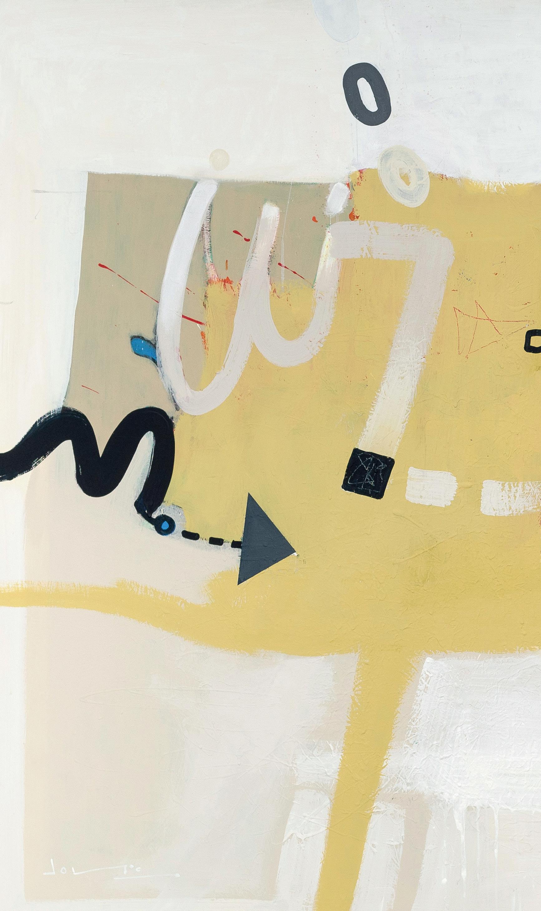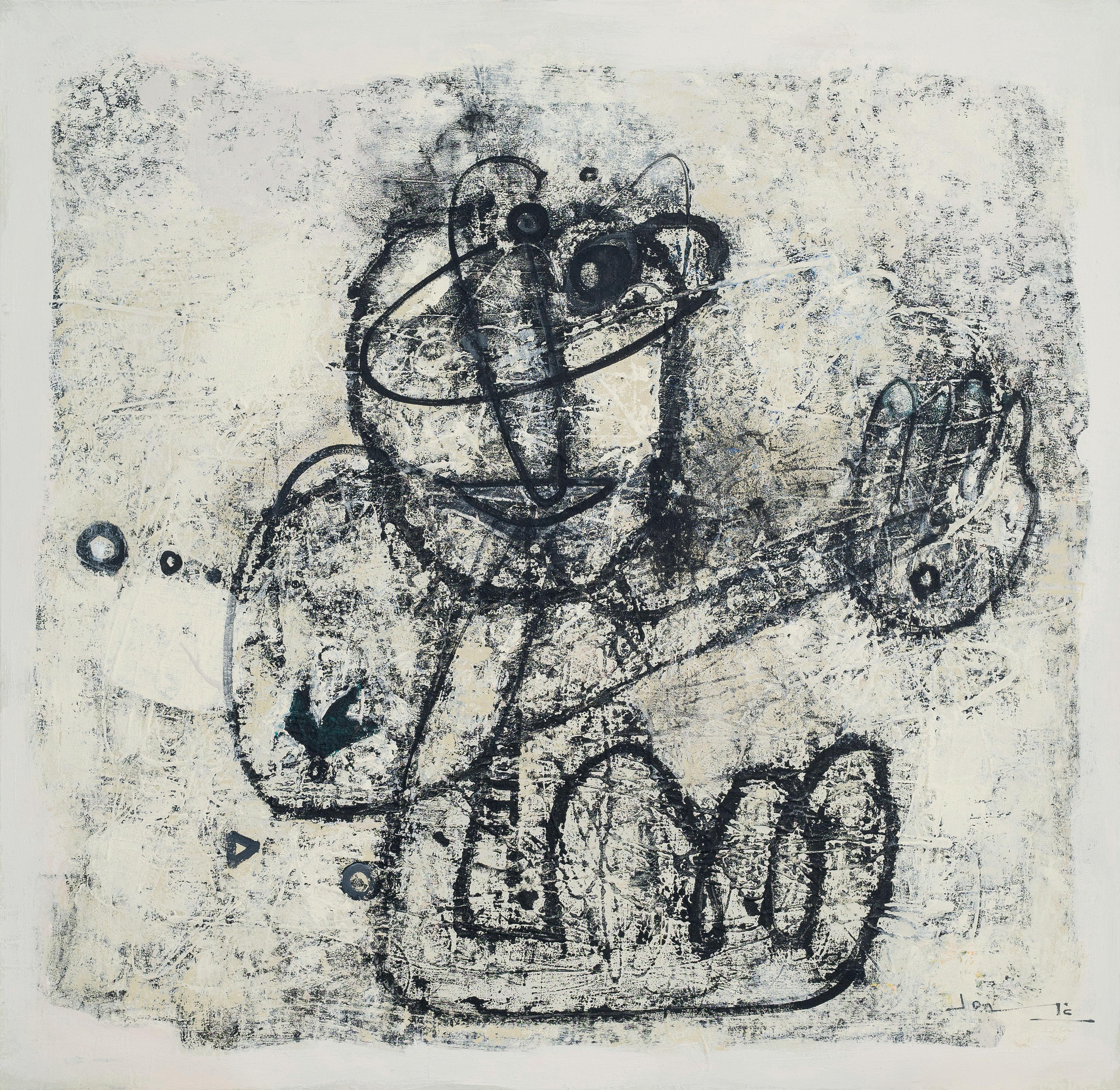 In the works of art of the latest period of painting lasting from 2008 to 2009, Jovic is more and more reducing the formal structure of a painting, together with its formative elements, according to the principle of the logical, expected and consistent way of development. The reduced shapes which are now correlating with each other implicitly include the reduction of the local colour. Generally speaking, the radical reduction of all expressive means of a language is inherent in these paintings. Jovic reduces the local colour to the almost bi–chromatic relationships between the achromatic tints of white and black colour. The cleaning is sometimes carried out to the verges of a minimalist shaping: two or three reduced figures, freely treated shapes, often mildly, expressively deformed.