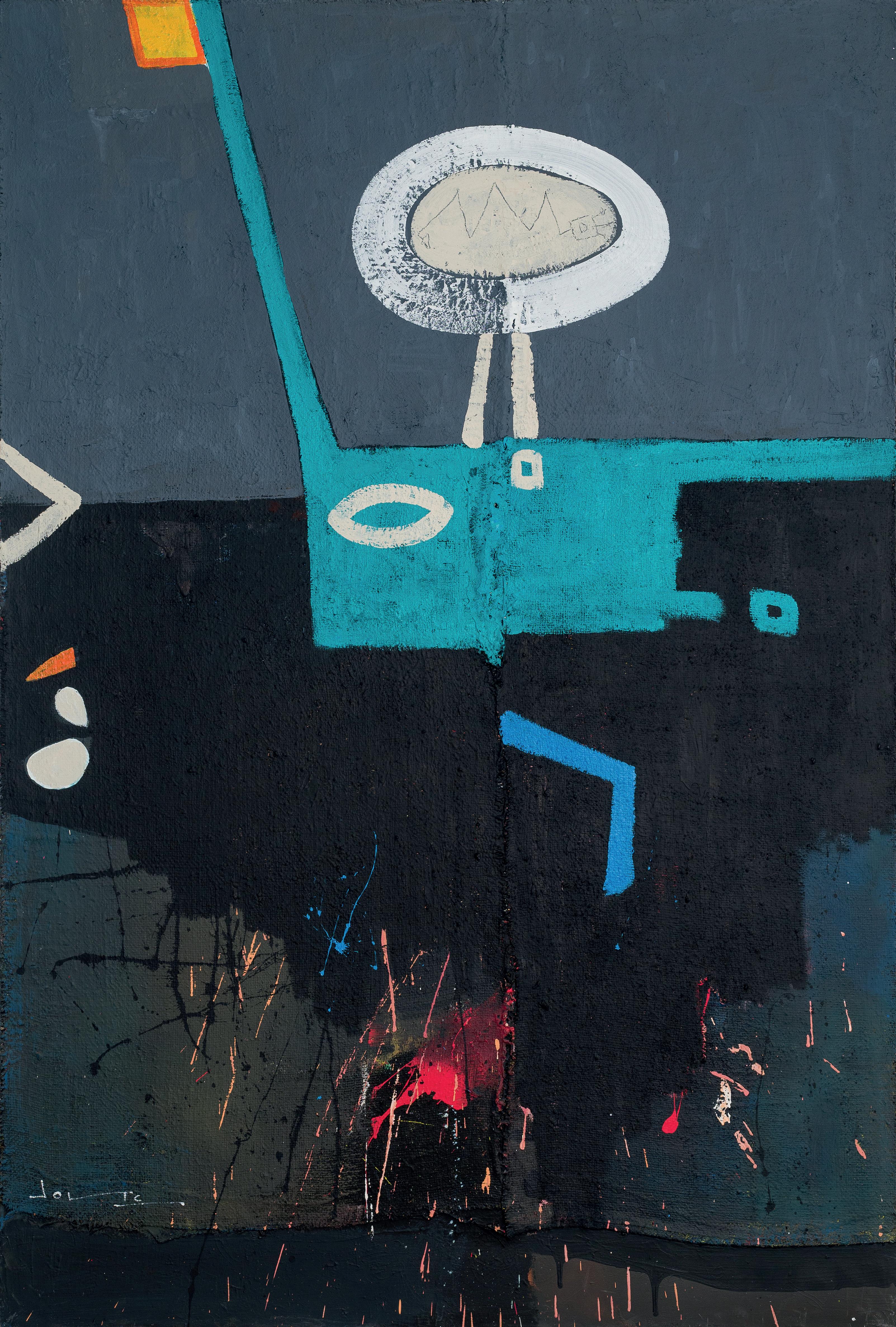 The painting entitled „The Great Inquisitor 2“, made in 2008, is also characteristic, particularly with its massive dominant surface reduced almost to one black mass of robot–like characteristics. Wide strokes of daubs and lines enter the black, heavy and static mass, as if breaking it through, establishing a certain type of dynamics. Two heads are placed in the upper part as well as the body, and the red glasses are put on one of them as a sign of a warning.