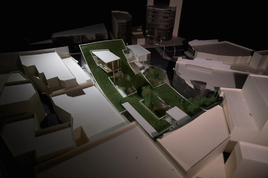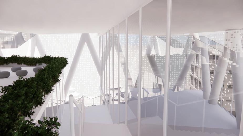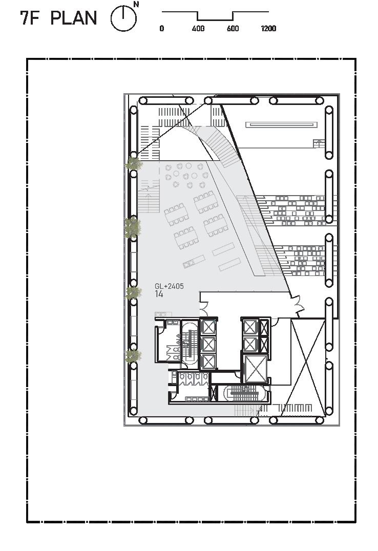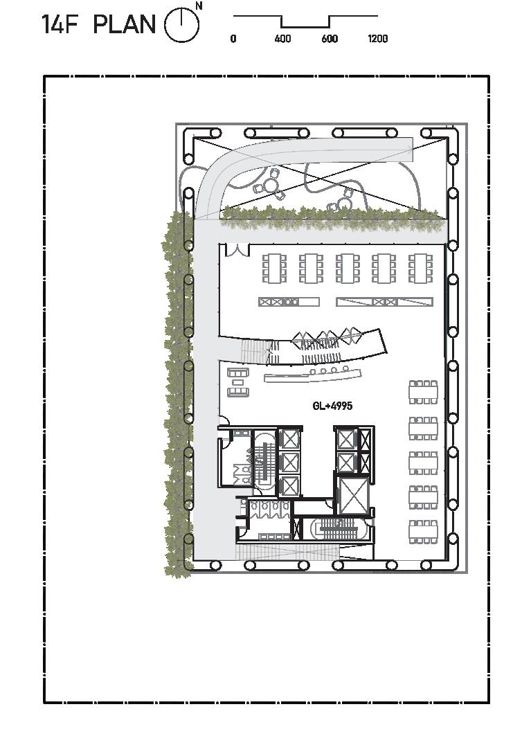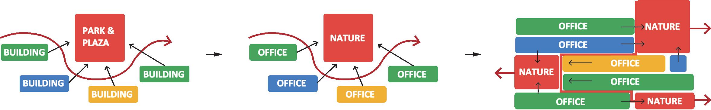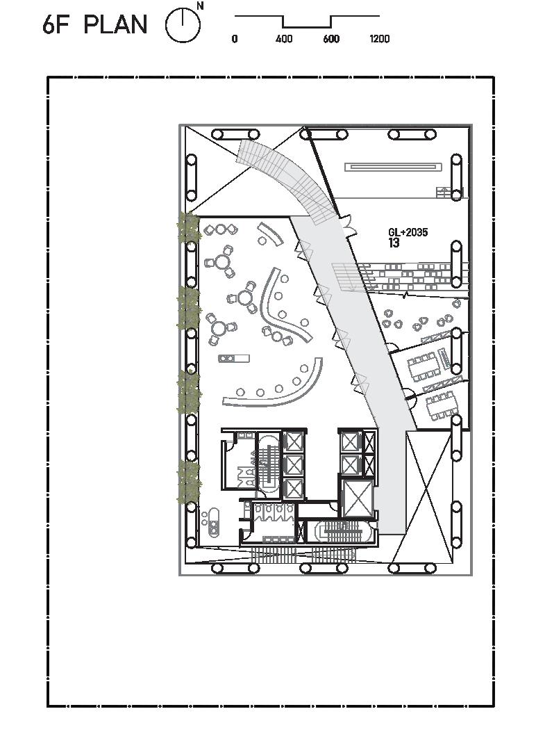 被公共空間包圍的辦公室: 整棟大樓被一條戶外開放 的路徑所貫穿,並且一路 向上攀升,使內部此用空