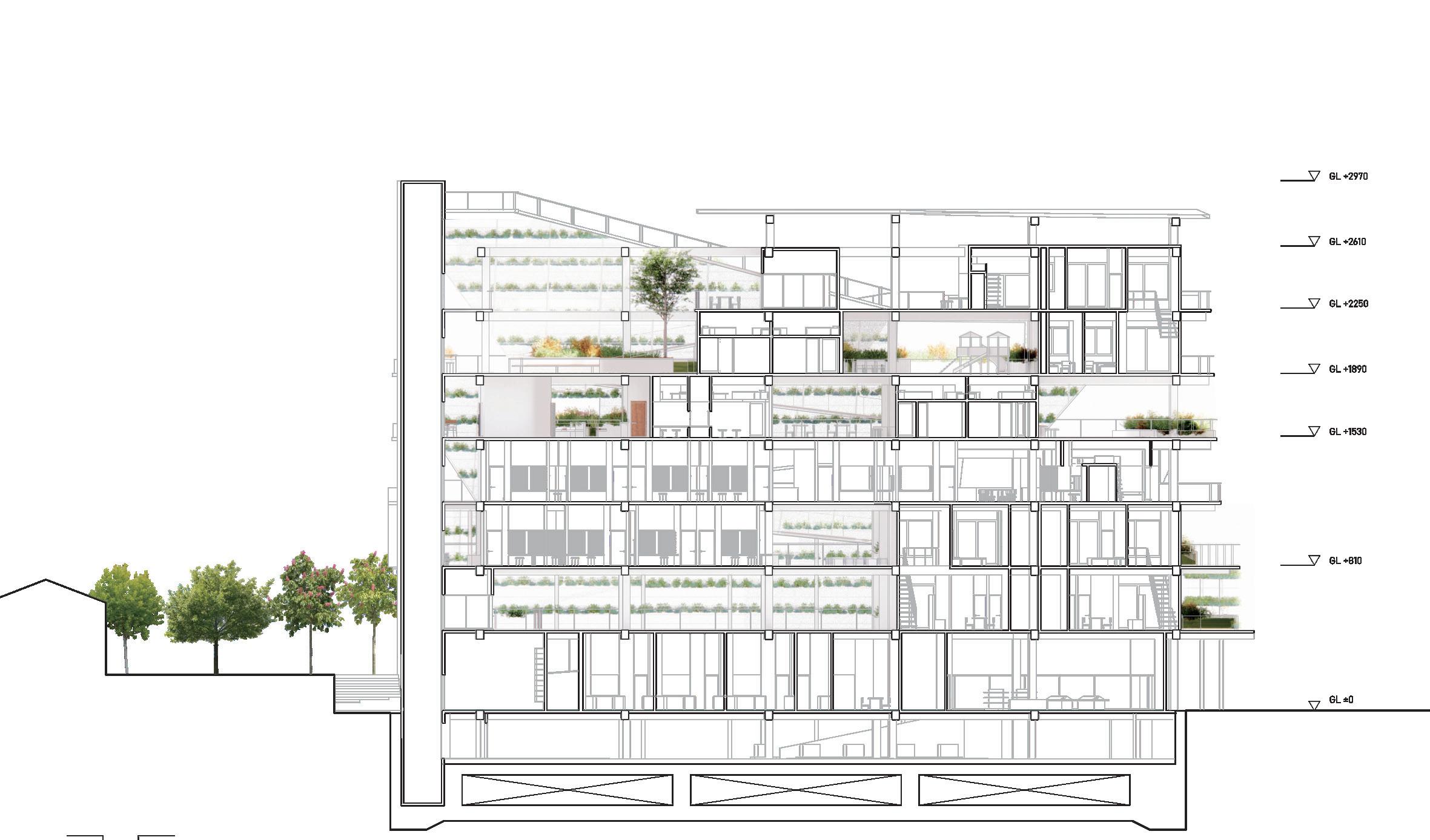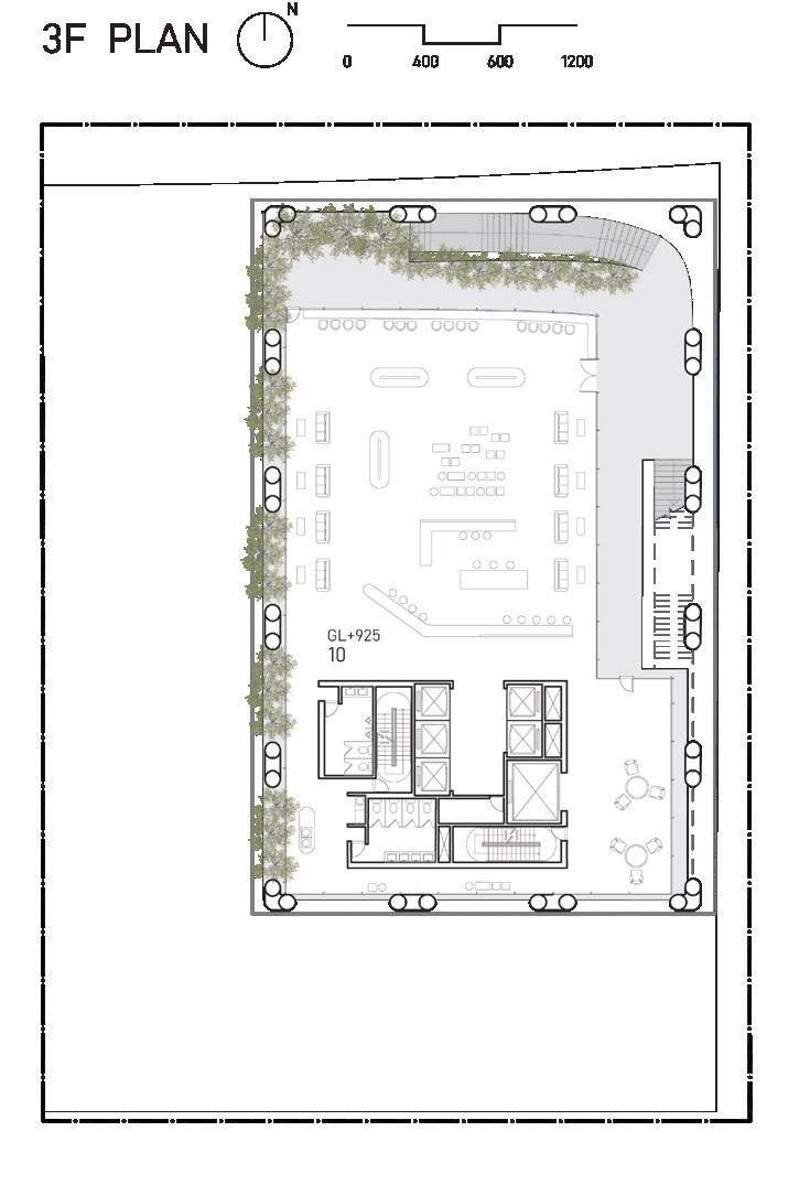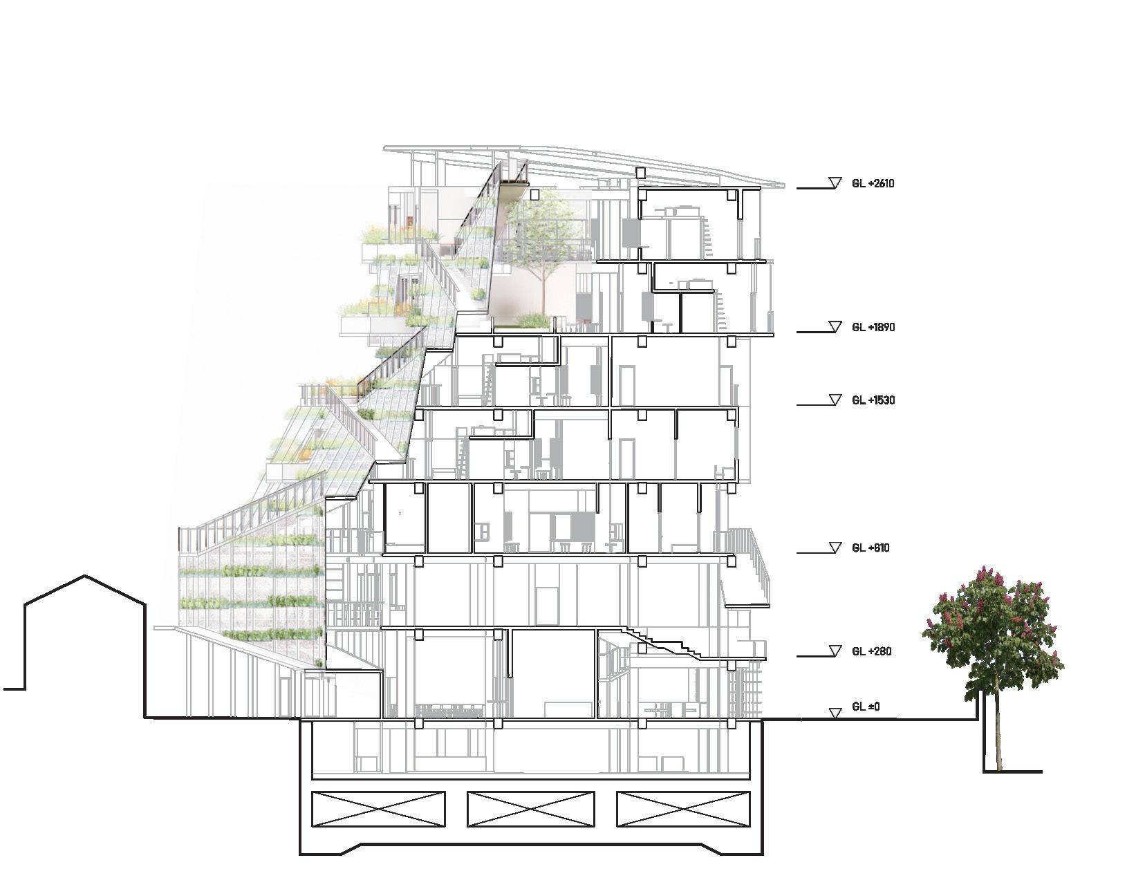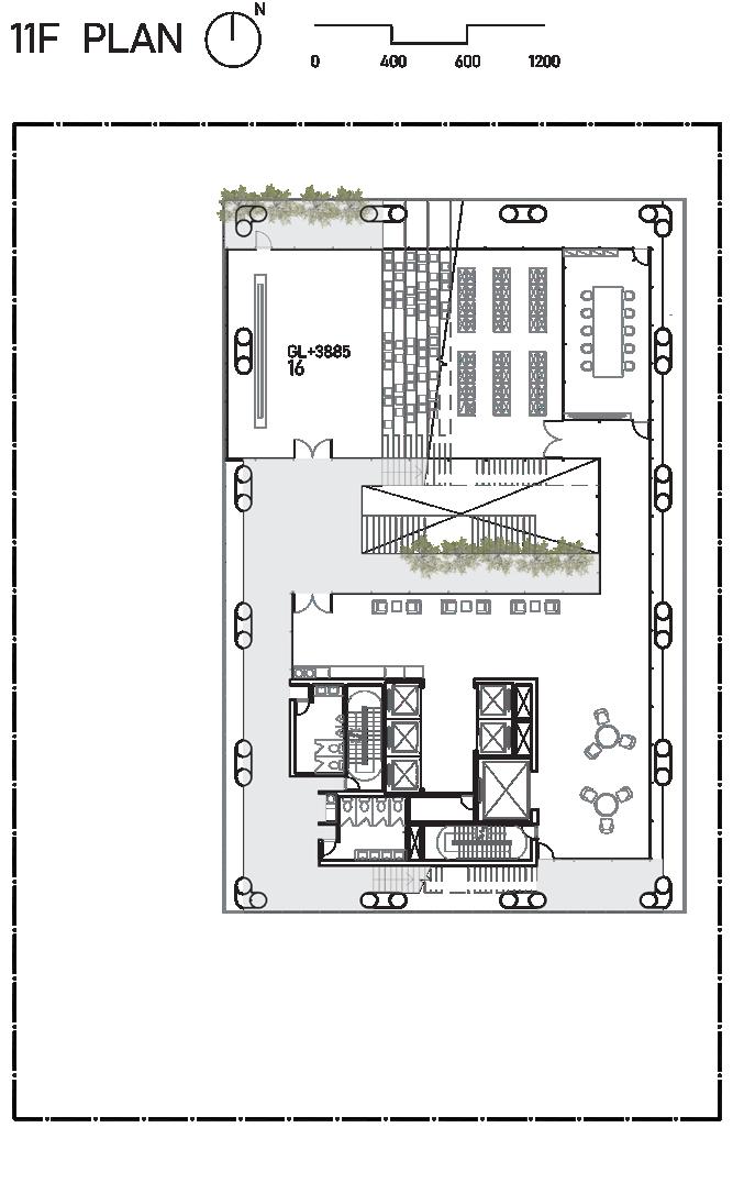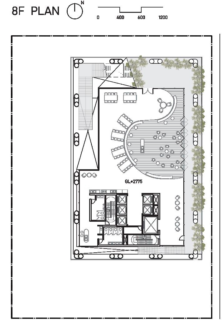 被公共空間包圍的辦公室: 整棟大樓被一條戶外開放 的路徑所貫穿,並且一路 向上攀升,使內部此用空