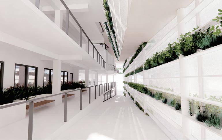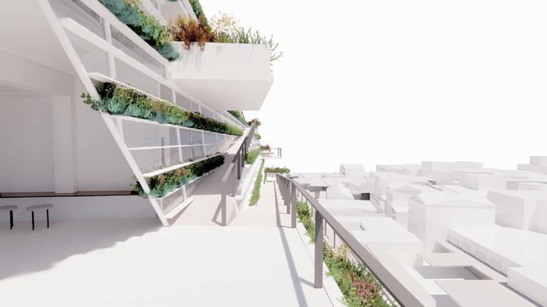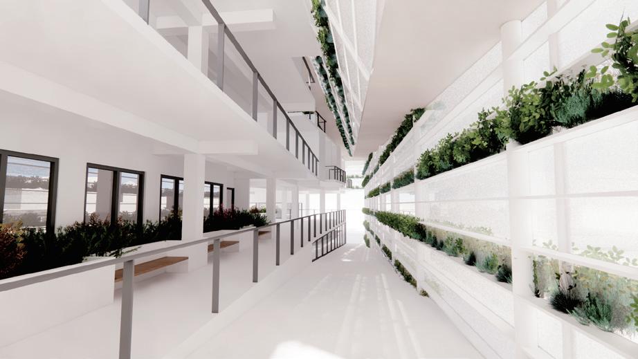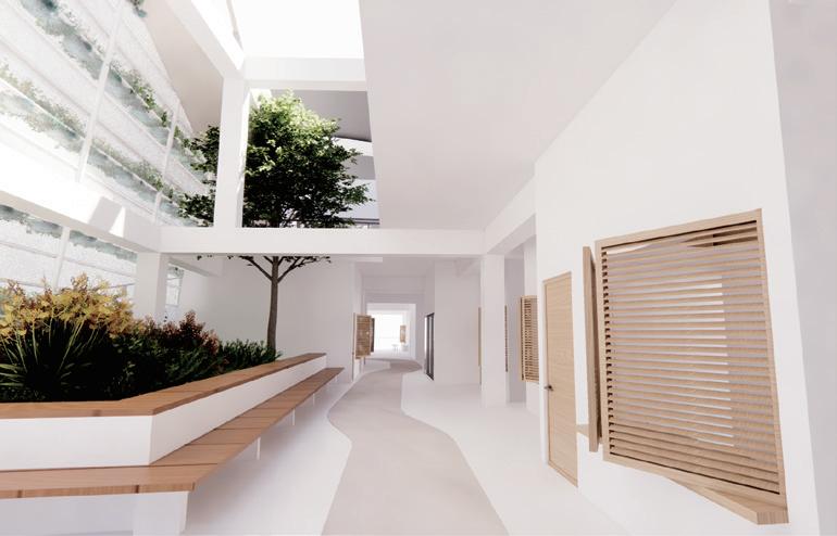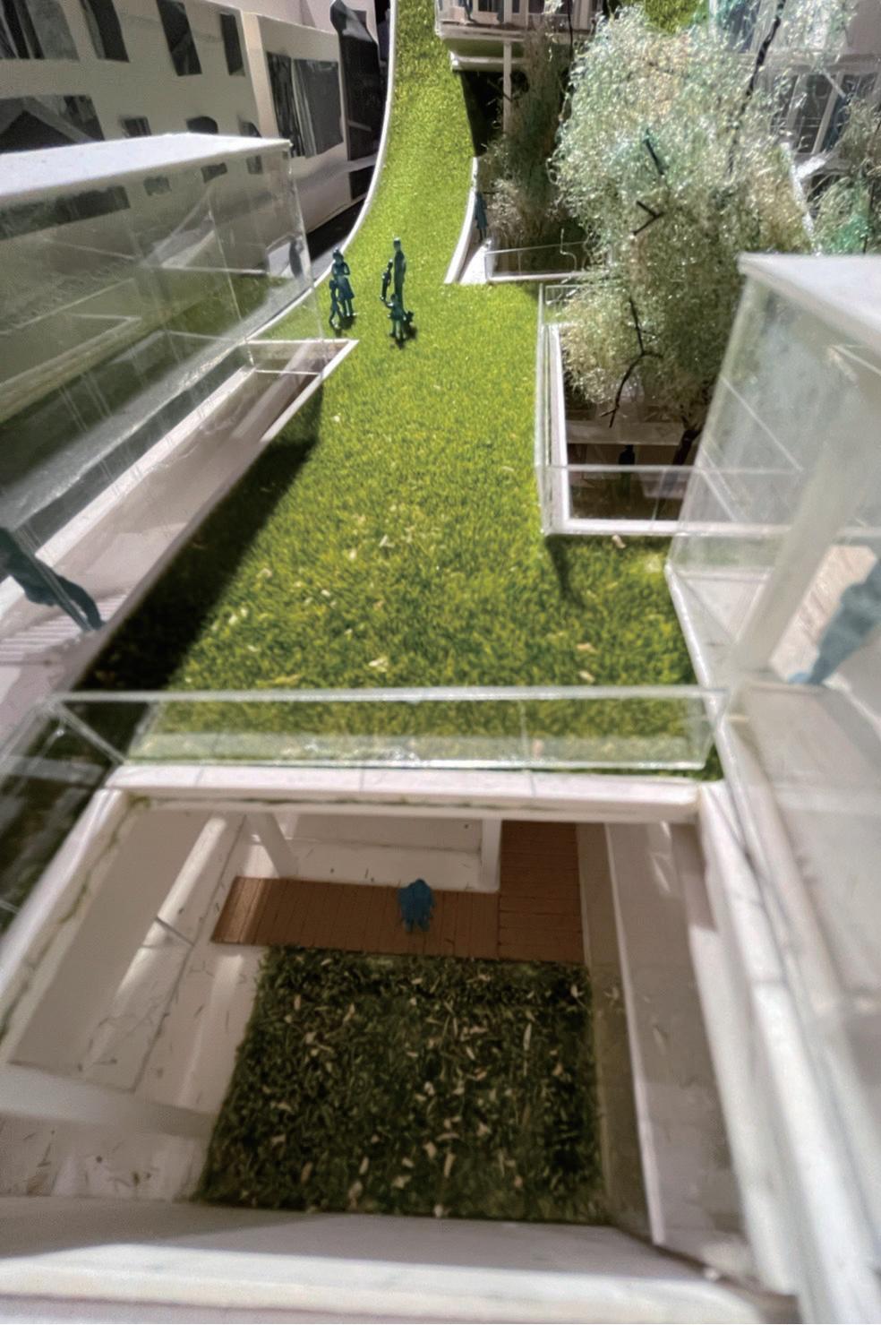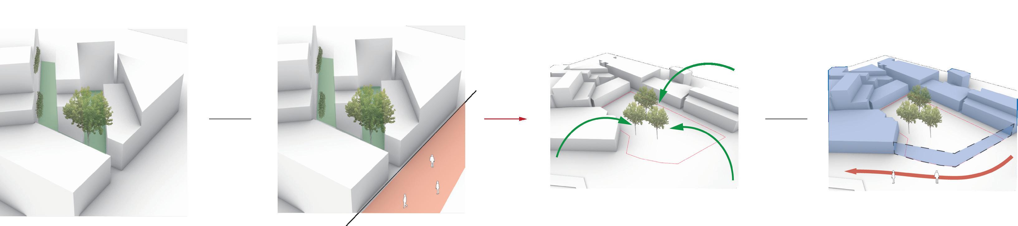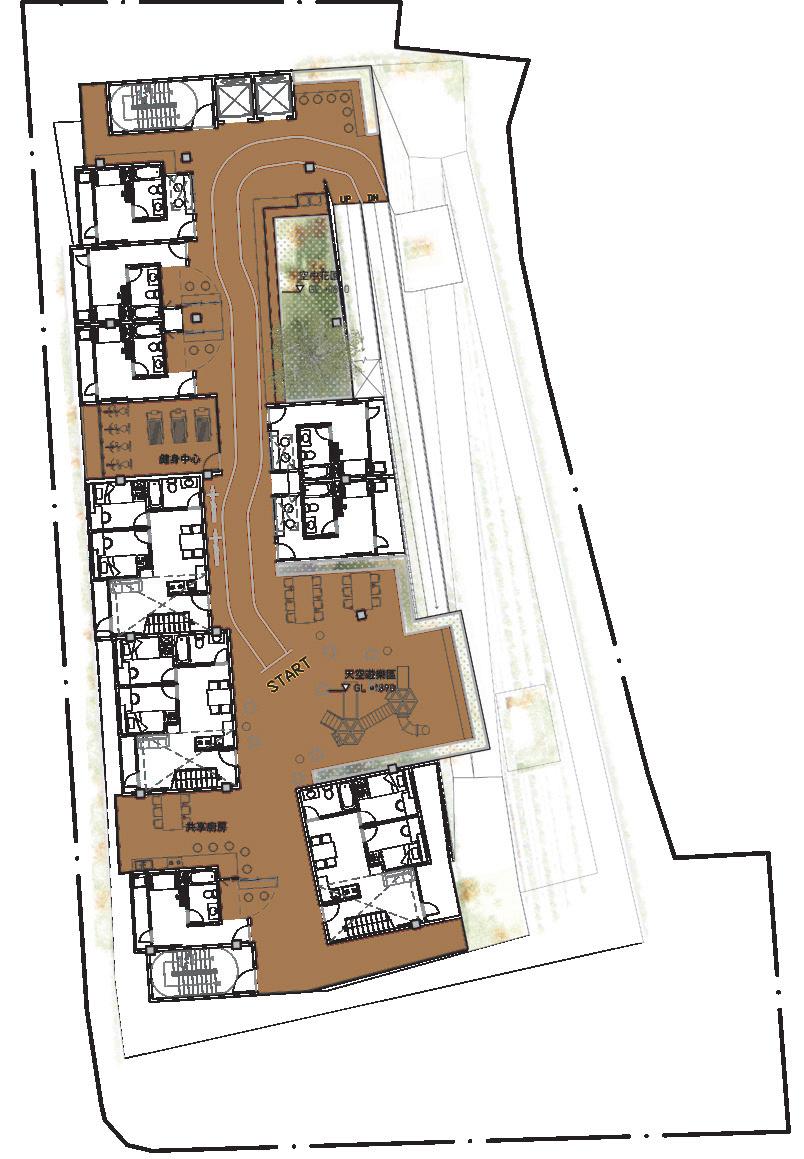將量體退縮使其對眷村較為友善,並且將路徑 引入,並且繞行整個量體,並產生公共空間。 透過種植植栽牆界提高居民的隱私空間,並從 中穿出公共空間,讓活動被閱讀,提升立面趣 味,並增加室內外的生活品質。