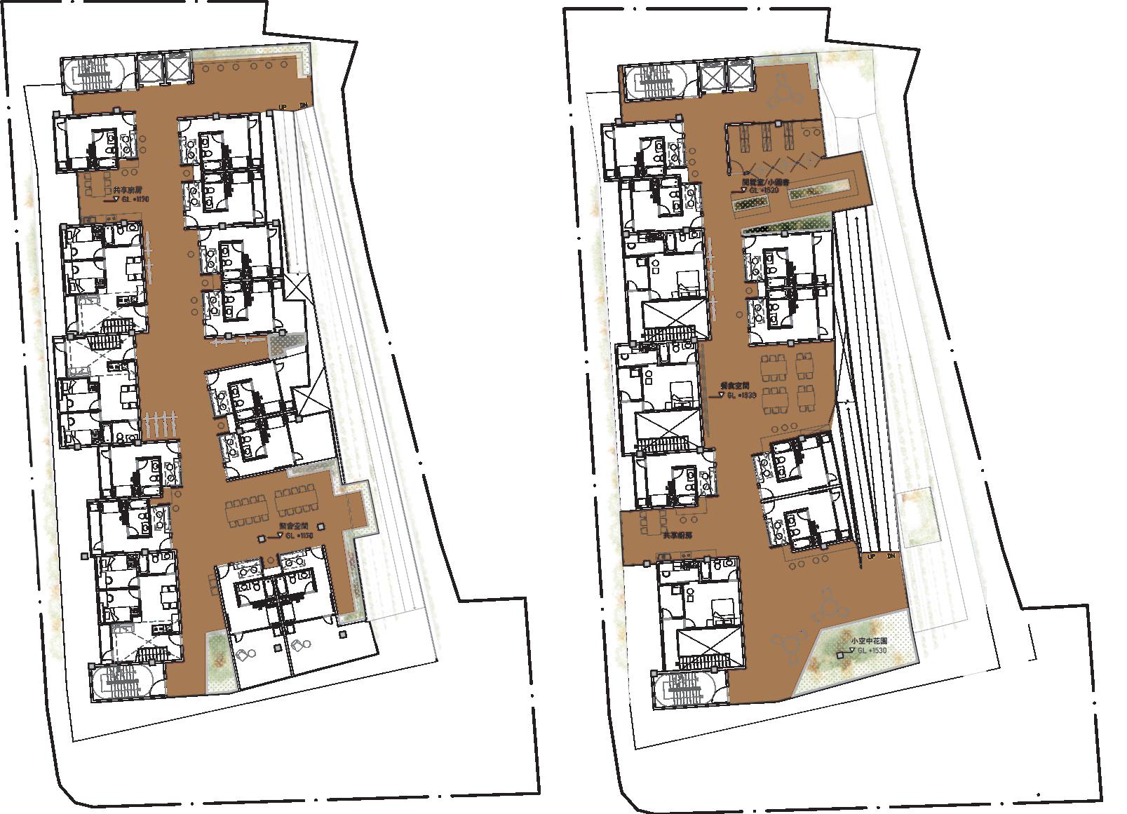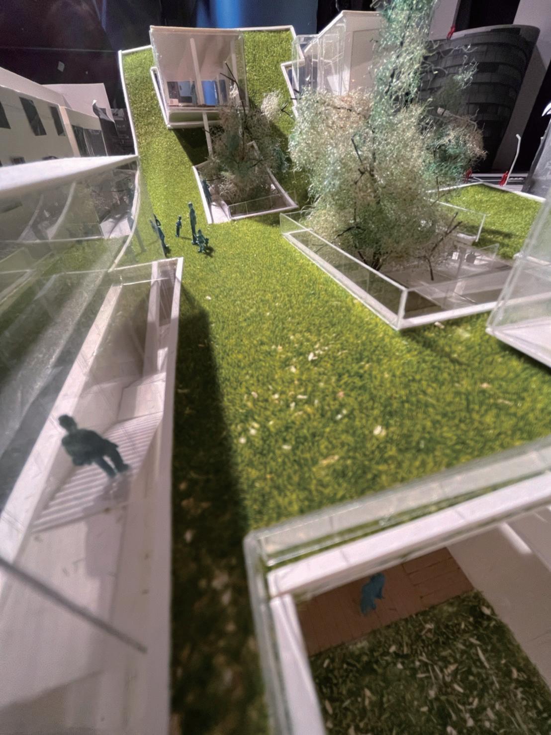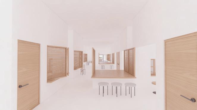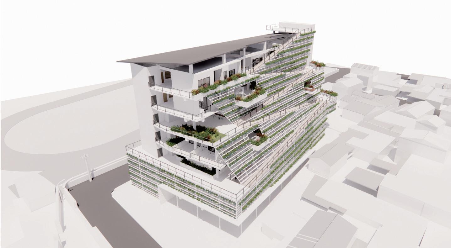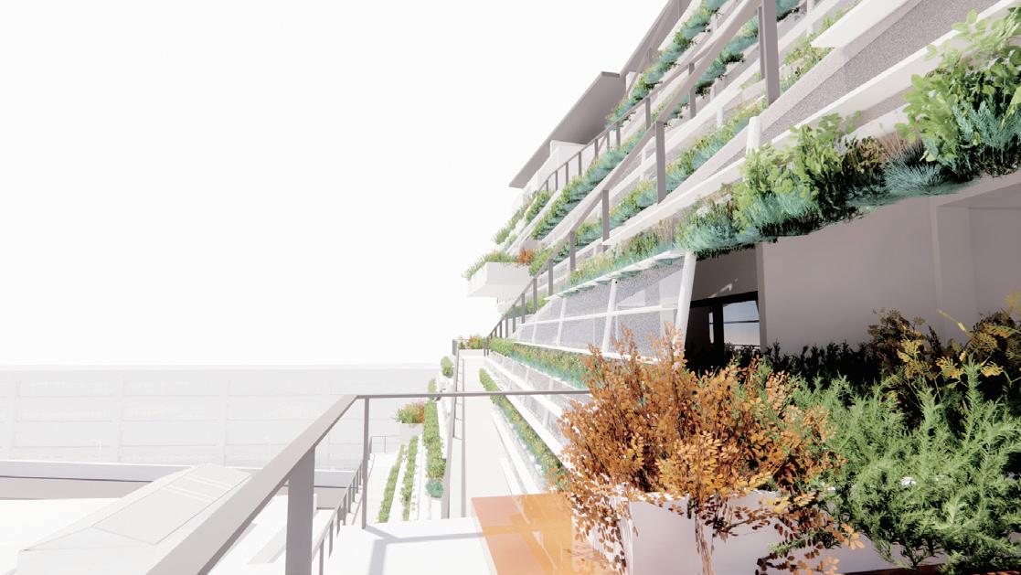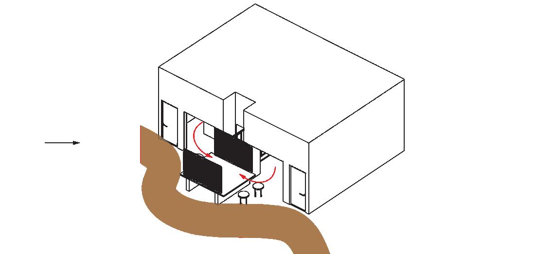將量體退縮使其對眷村較為友善,並且將路徑 引入,並且繞行整個量體,並產生公共空間。 透過種植植栽牆界提高居民的隱私空間,並從 中穿出公共空間,讓活動被閱讀,提升立面趣 味,並增加室內外的生活品質。
