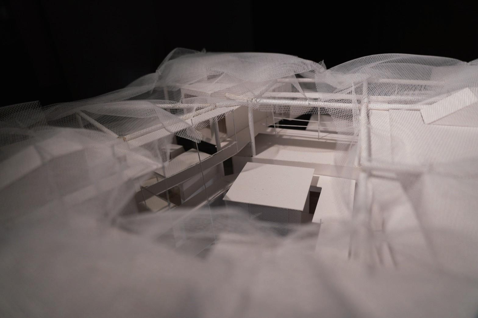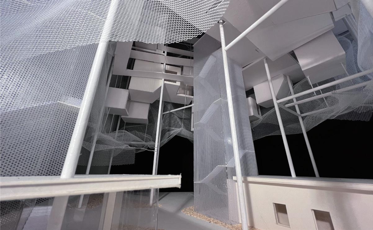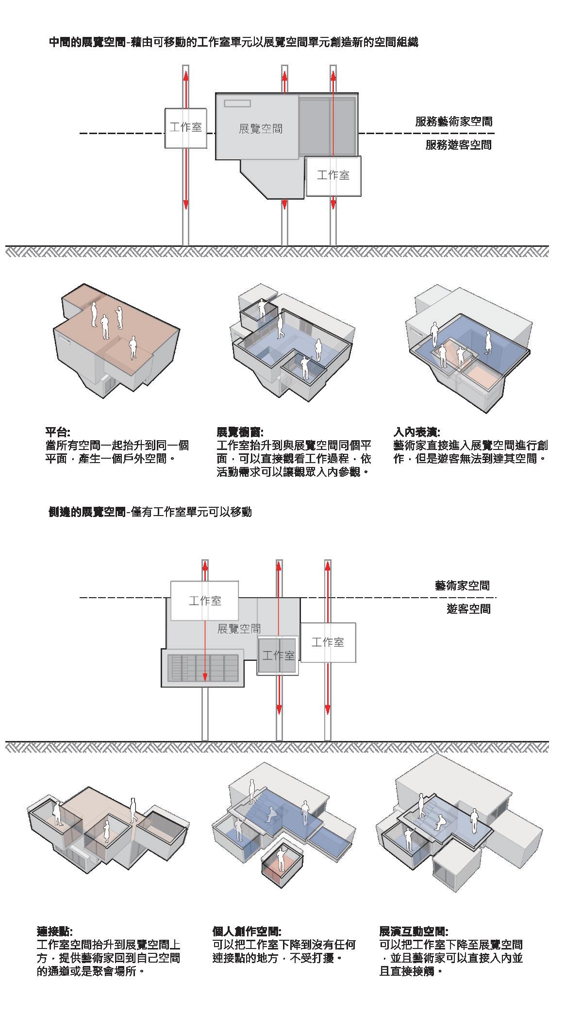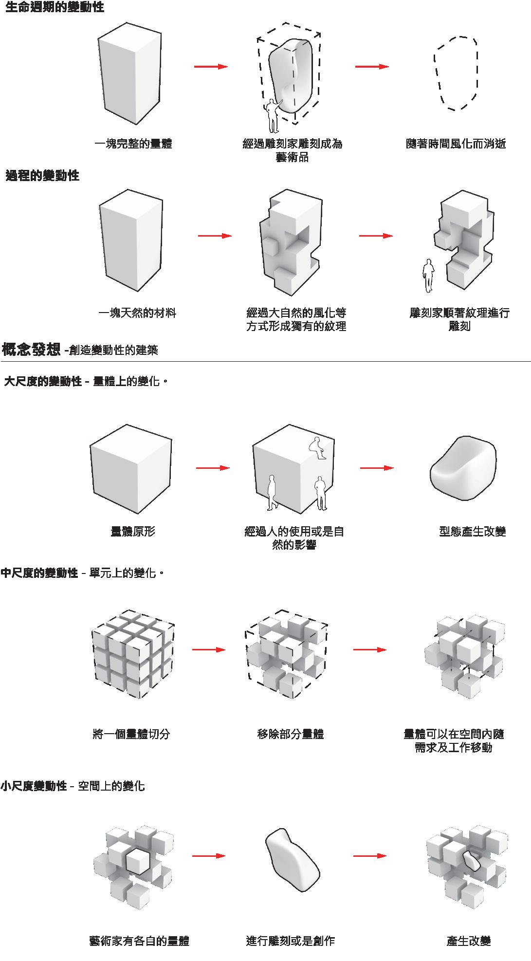 空間的設計概念是希望可以把雕刻家的創作性質以及其創作材料的特性融入建築的設 計中,就是一個慢慢變化的過程,並且透過建築內部量體的上下移動以、不同雕刻家的進 駐產生大尺度(建築立面)、中尺度(內部量體)以及小尺度(內部空間)的變化,並且讓遊客 可以透過在建築外面就可以看到這些事情的發生,除了建築外部帶來的效果以外,內部 的各個量體也為了呼應雕刻家的性質而在空間上有許多切挖的質感,讓整體的空間更符 合雕刻家的意象,建築本體就是一個雕塑品。
