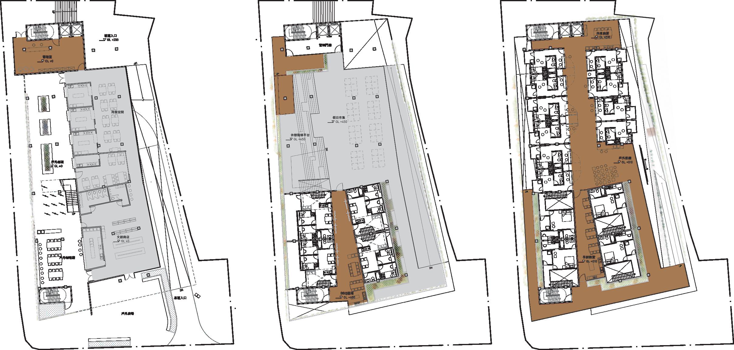 空間的設計概念是希望以淡水最讓人印象深刻的淡水河以及觀音山最為主要的形體設計方向,並且使用淡水的巷子 作為貫穿整體設計的主要概念,透過不停轉折的長牆來去圍塑空間,並且透過這些折板來提供不同程度的隱私性以及 開放性,此外還有透過不同透明度的牆體來產生出不斷變化的密度以及不同的隱私性來產生進入空間的戲劇性,希望 可以提供給參觀者一個動態的建築,隨著時間或是位置的不同都可以有不同的感受。