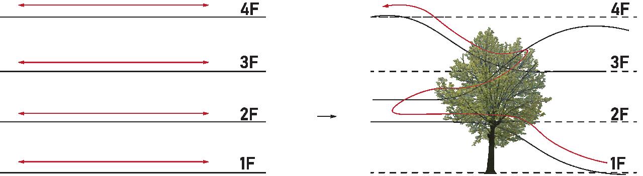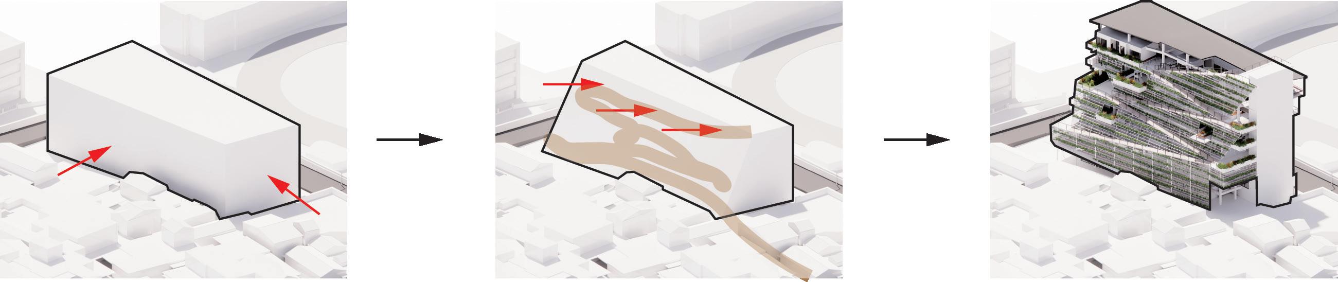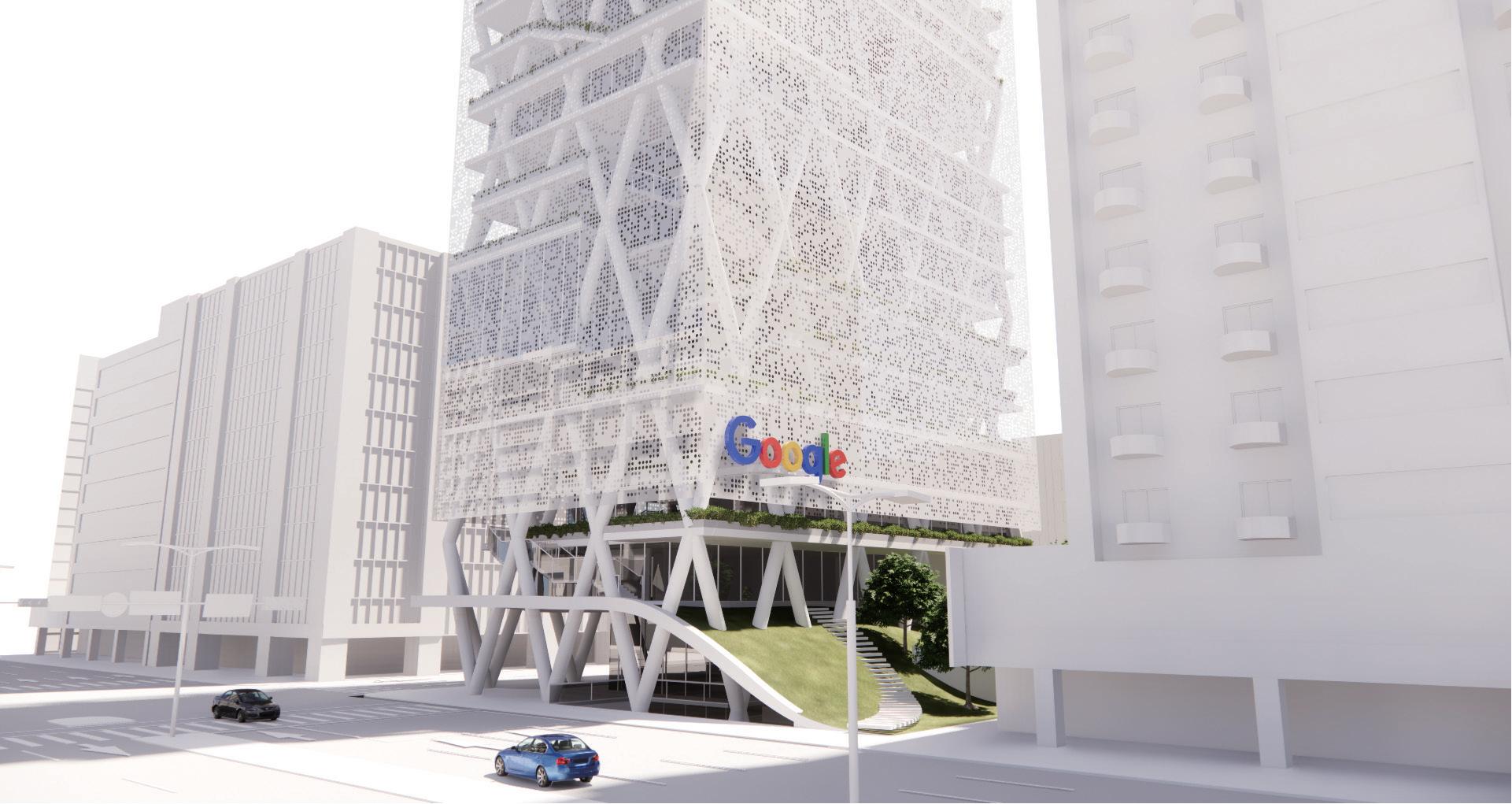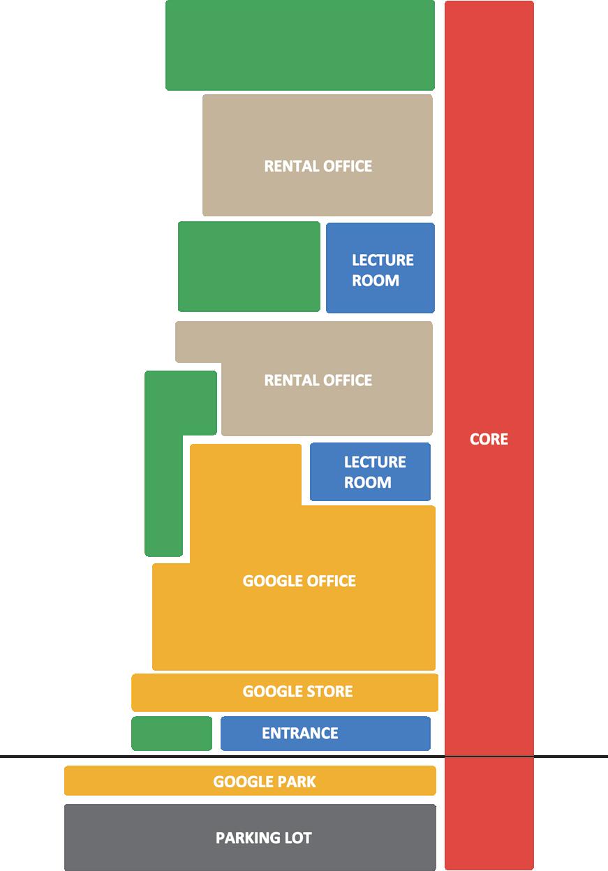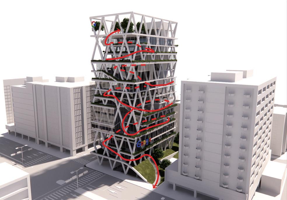 Google作為一家知名的跨國網路科技公司,我認為這間公司就是在進行聚集與發散這個動 作,透過收集使用者自動自發上傳的資訊,整理並且歸類後,傳送給需要的人,我希望透過這 樣的邏輯來貫穿整個辦公大樓的設計。並且去思考什麼樣的空間是會吸引人們去聚集的,發 現大自然可能是一個很好的空間,並且集合各個陽台來產生一個大的自然環境,並且透過一 條貫穿整棟建築的道路,去串聯辦公室以及這些戶外空間,模糊內外邊界的事情,讓室內與室 外的區分不再那麼的絕對,且對於辦公的方式或地點有更多的可能性。