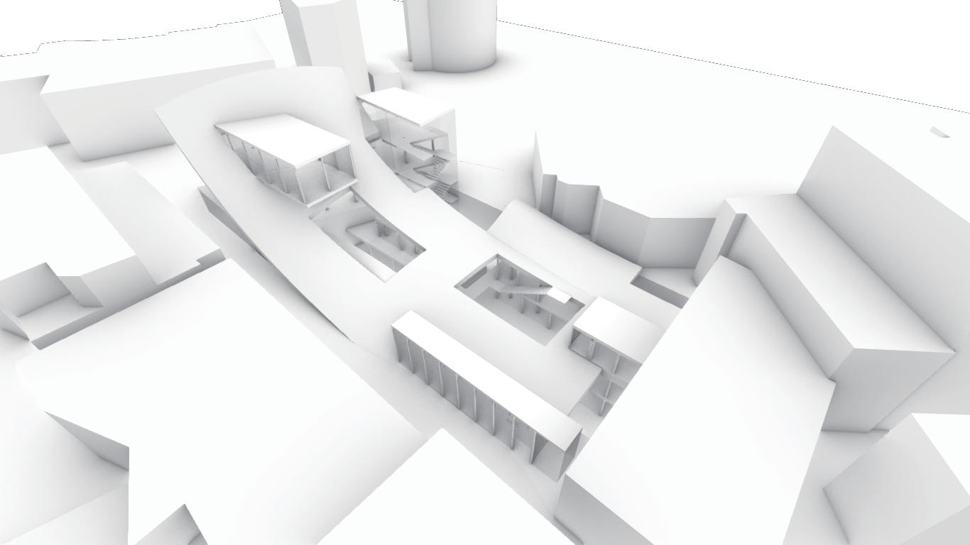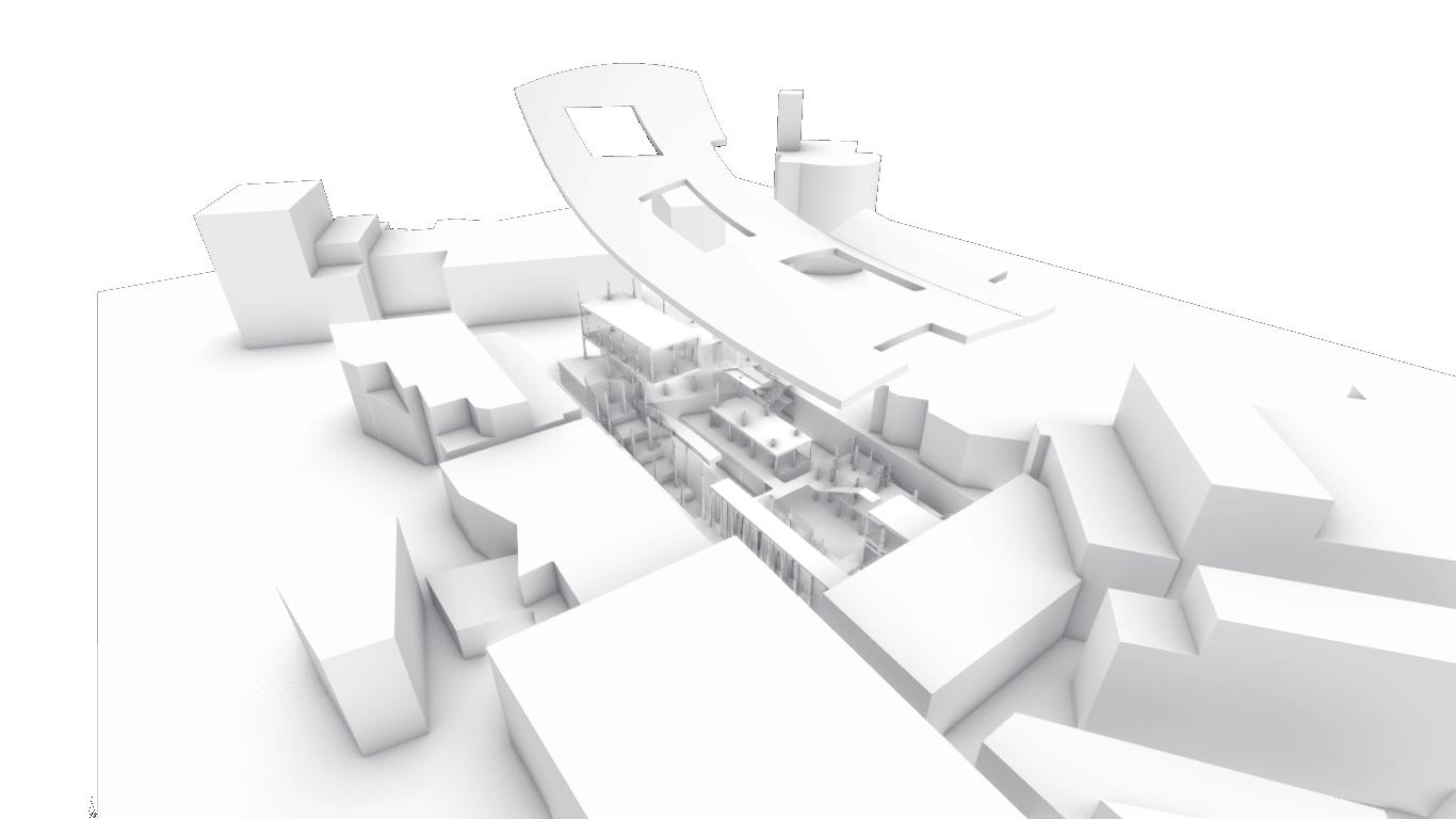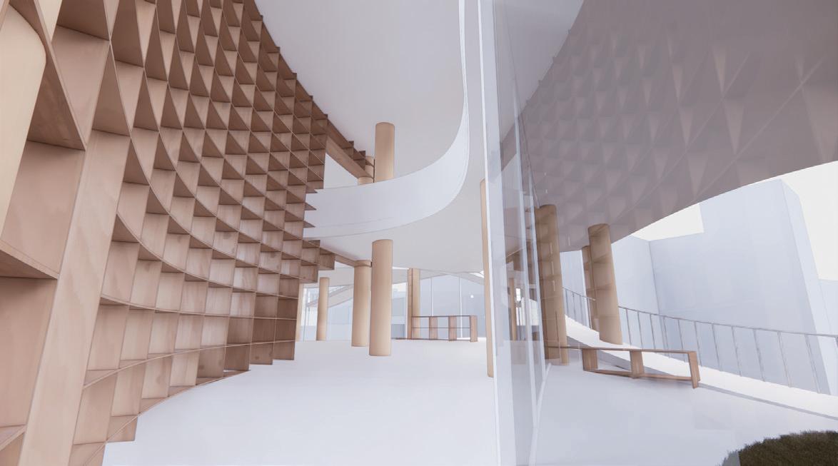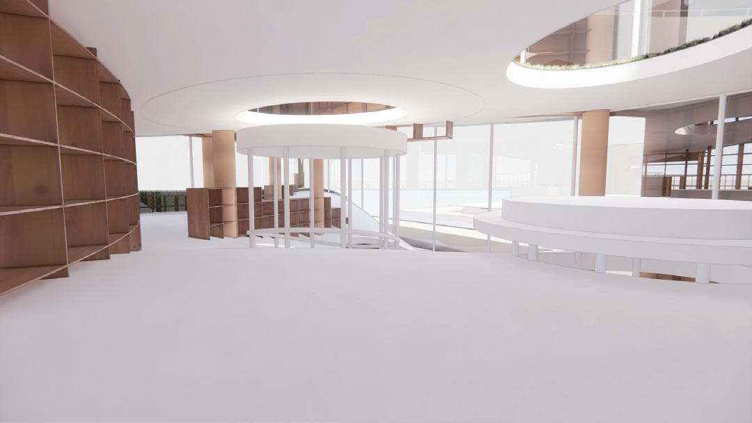 空間的初始概念是以鏡頭作為最初的發想點,並且帶入鏡頭的結構來進行操作,整體空間彎曲,以提升延生感,並且內部 空間被外部框架吊起來,使兩個不同的系統容易被閱讀,此外為了使空間的連續性不被打斷,因此側邊不開窗,取而代之 的是屋頂玻璃讓光線灑進空間中,而內部的走道拉開,讓使用者能感知基地存。最後結尾的半開放性空間,透過延生出來 框住外面的景,就像是鏡頭的光圈葉片,使光線被柔化,站在外面延生出來的地方,觀看兩邊不同的光景。