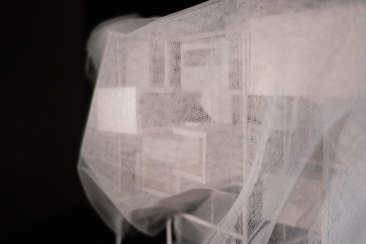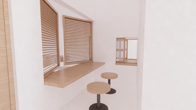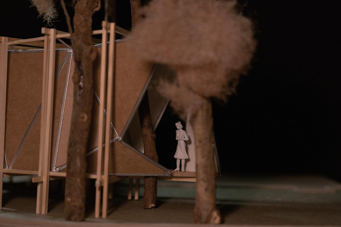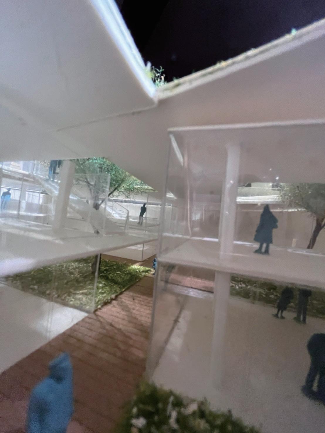 空間的初始概念是以鏡頭作為最初的發想點,並且帶入鏡頭的結構來進行操作,整體空間彎曲,以提升延生感,並且內部 空間被外部框架吊起來,使兩個不同的系統容易被閱讀,此外為了使空間的連續性不被打斷,因此側邊不開窗,取而代之 的是屋頂玻璃讓光線灑進空間中,而內部的走道拉開,讓使用者能感知基地存。最後結尾的半開放性空間,透過延生出來 框住外面的景,就像是鏡頭的光圈葉片,使光線被柔化,站在外面延生出來的地方,觀看兩邊不同的光景。