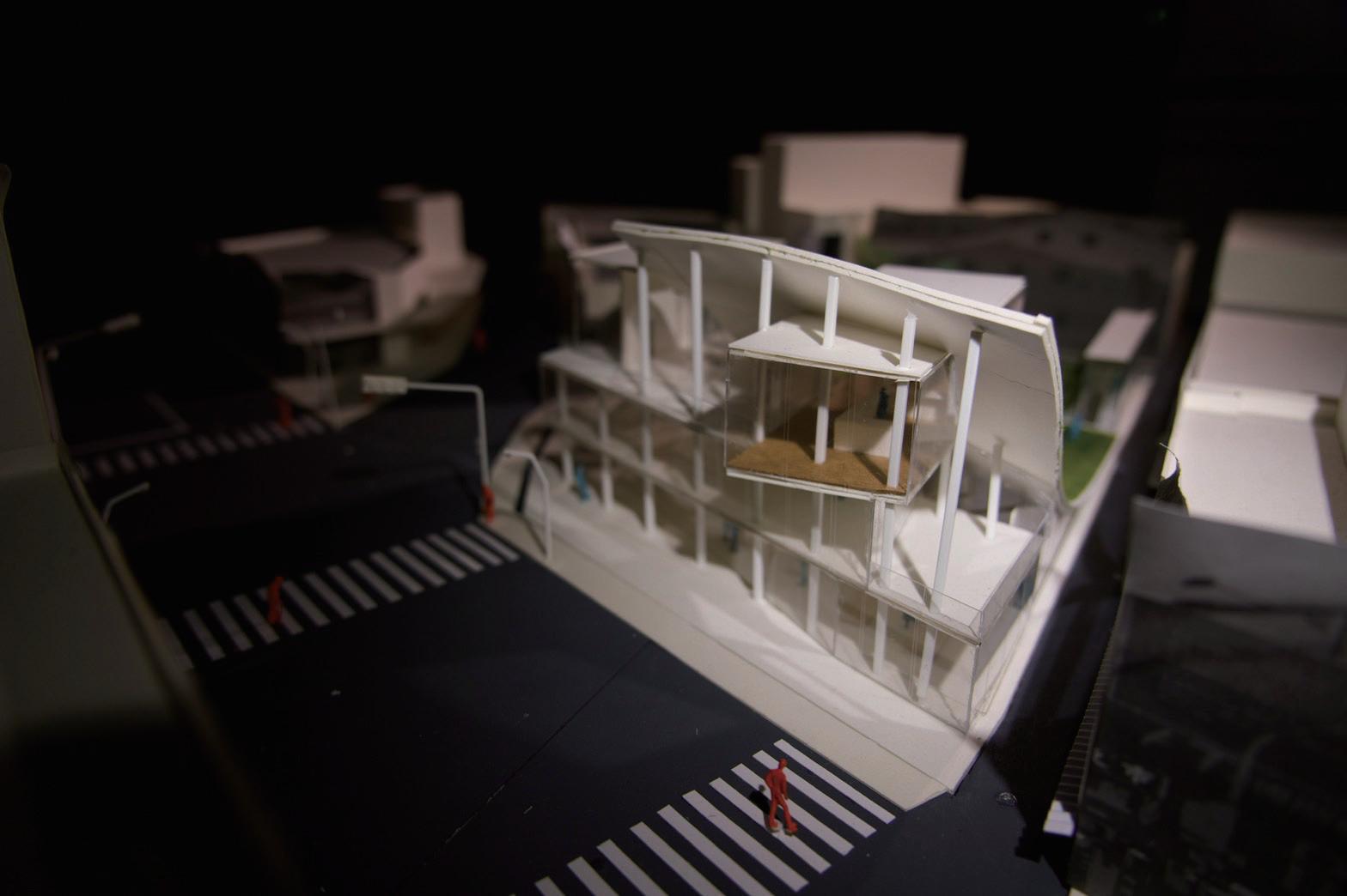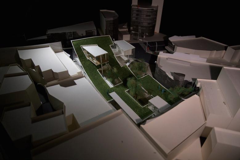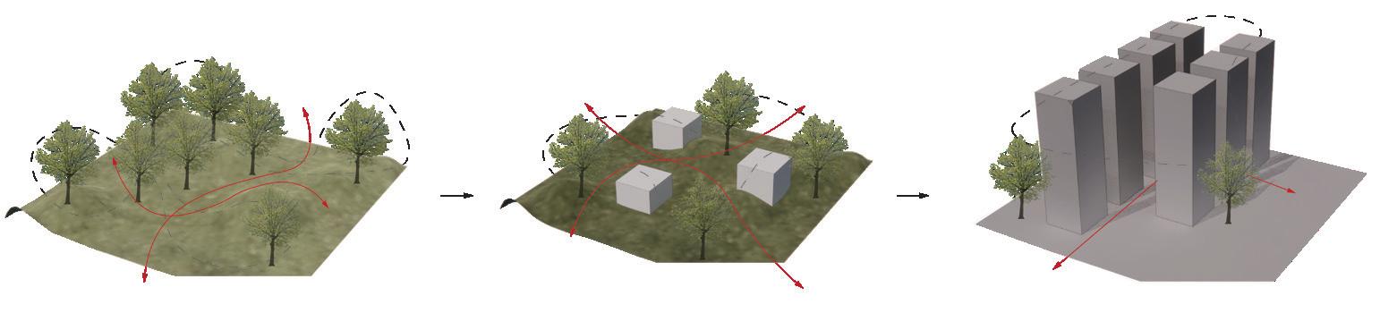 基地位在台北市中心的士林夜市,整個區域被水泥牆所包圍,我希望將基地增加綠意以 提升都市的生活環境,提升辦公室品質,並且去呼應原基地士林缺乏綠蓋的意象,將綠地 樹林重新影藏回基地之中,並且製造介面,透過這個介面來區分不同區域的意象並且可 以透過穿梭介面前後感受空間與介面之間的關係,產生一直不斷變化的空間的戲劇性, 而都市面向的另外一面就是一個廣大的草坪,提供一個都市讓人使用的寬闊綠地,重回 大自然的懷抱,並且增加整個都市的生命力。