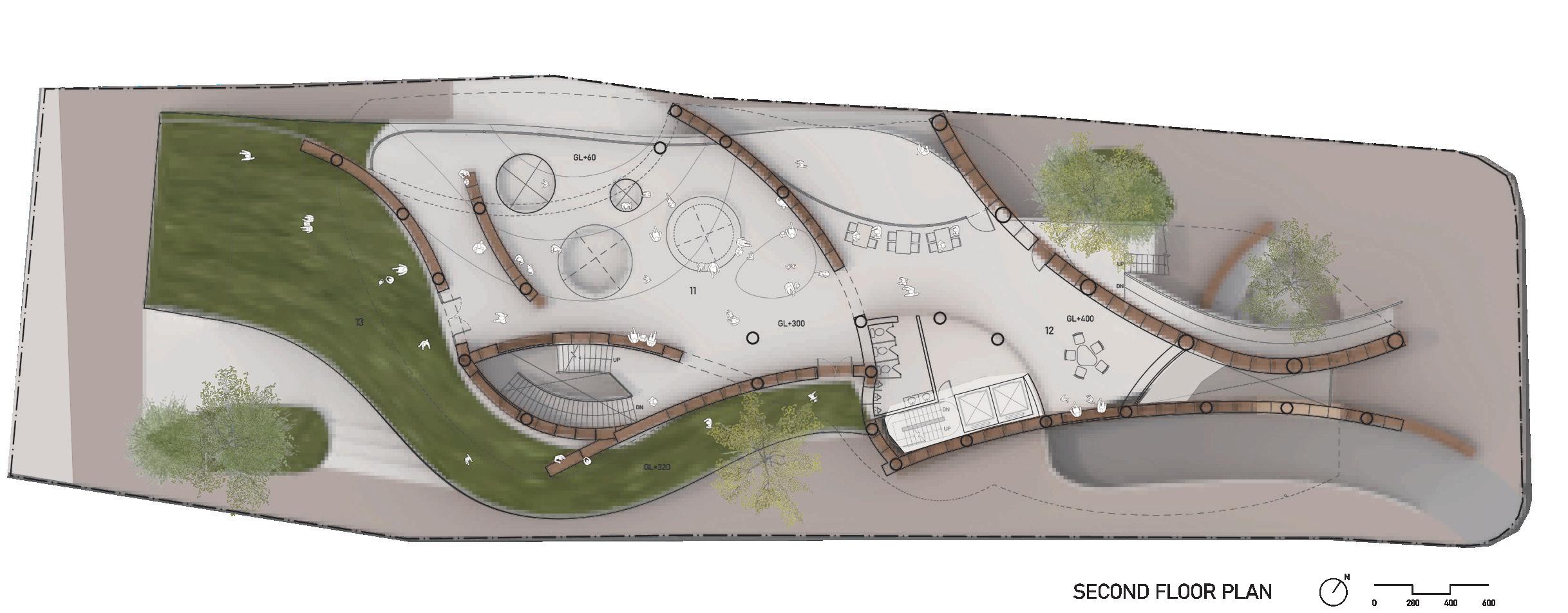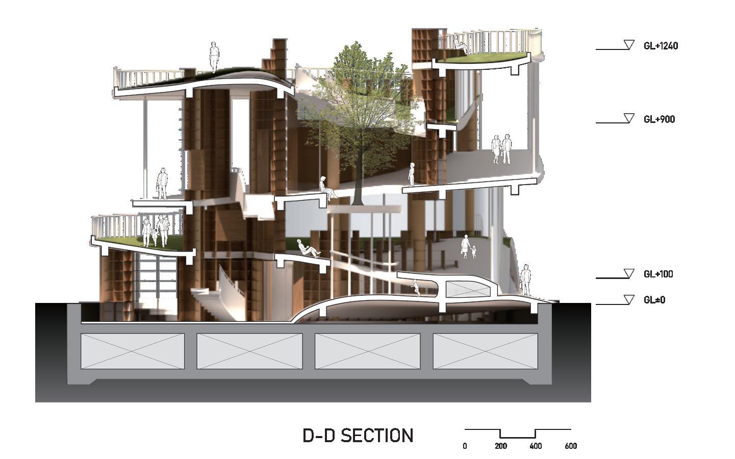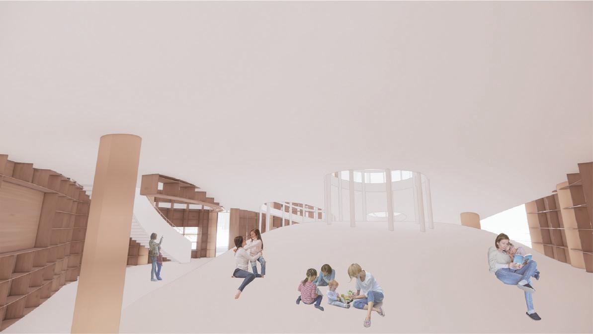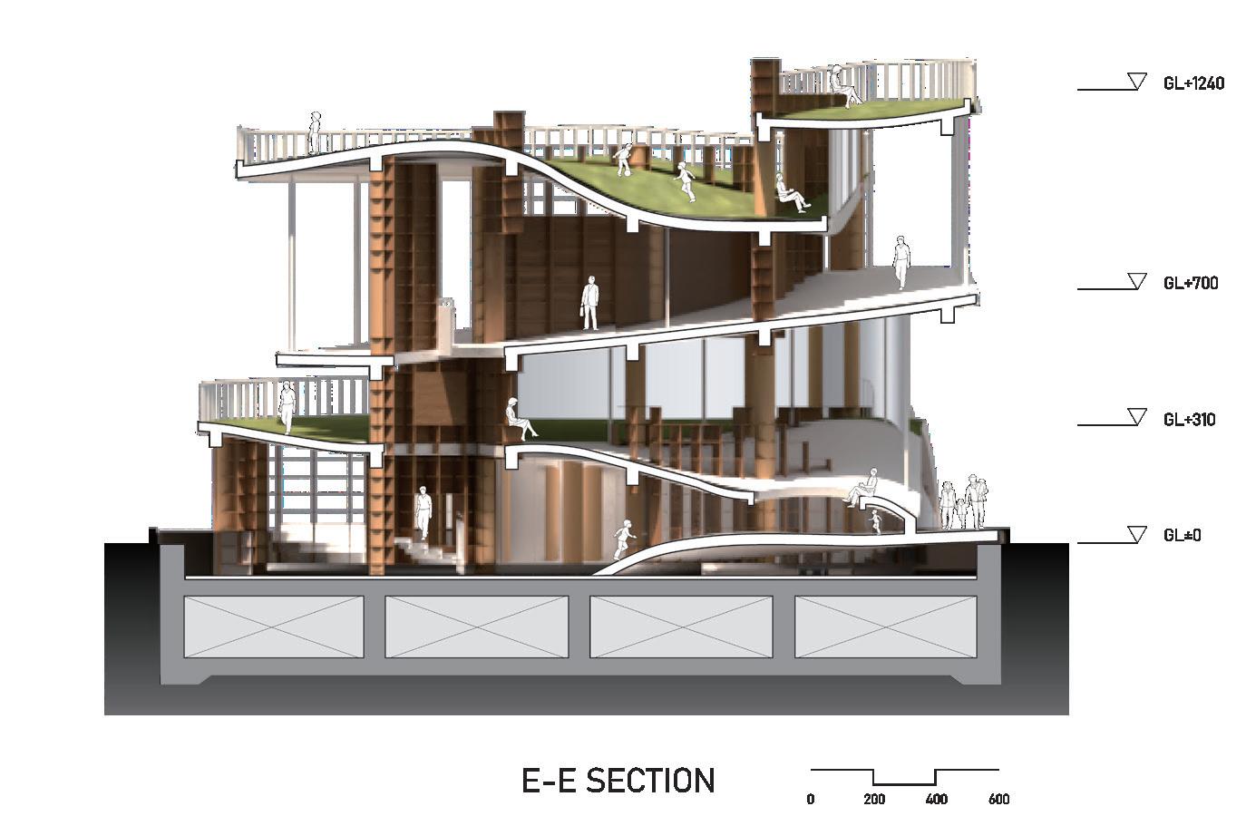 建築的牆體是以書櫃作為意象所連續牆,並且透過不同 的方向的封版來產生不同的使用機能,包含對內與對外 的使用空間。而樓板的向上或是向下彎曲可以打破空間 的樓層限制,讓每一層的空間互相可以有關係,讓層與層 之間的交流更加密切也讓小朋友有更多的機會可以去探 索整個空間。