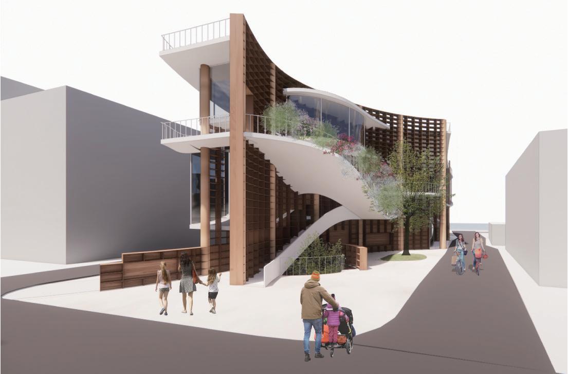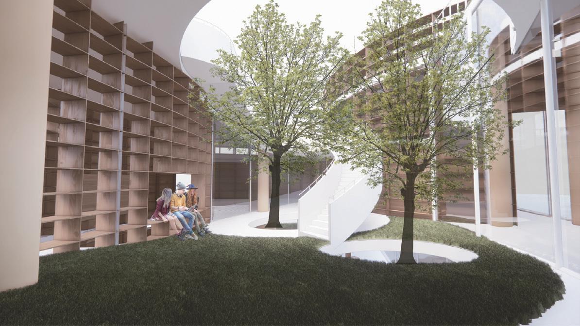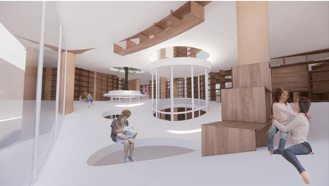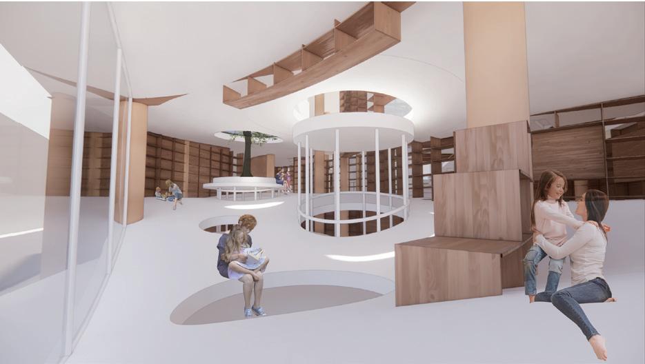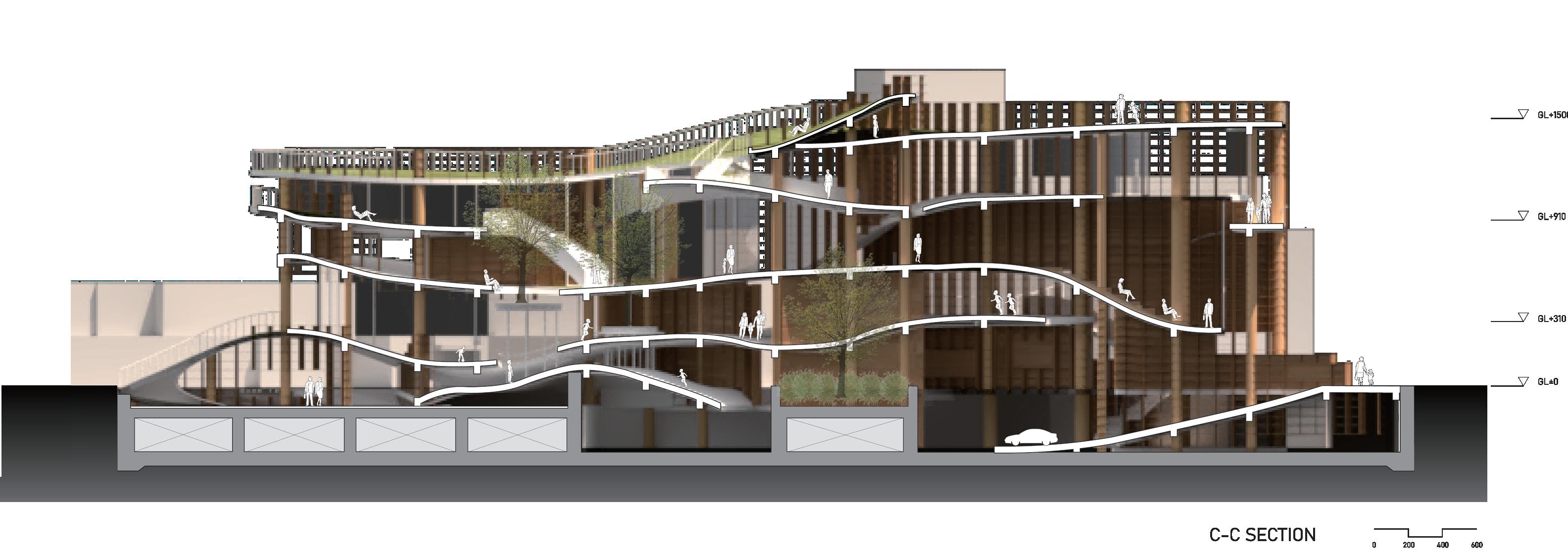 建築的牆體是以書櫃作為意象所連續牆,並且透過不同 的方向的封版來產生不同的使用機能,包含對內與對外 的使用空間。而樓板的向上或是向下彎曲可以打破空間 的樓層限制,讓每一層的空間互相可以有關係,讓層與層 之間的交流更加密切也讓小朋友有更多的機會可以去探 索整個空間。