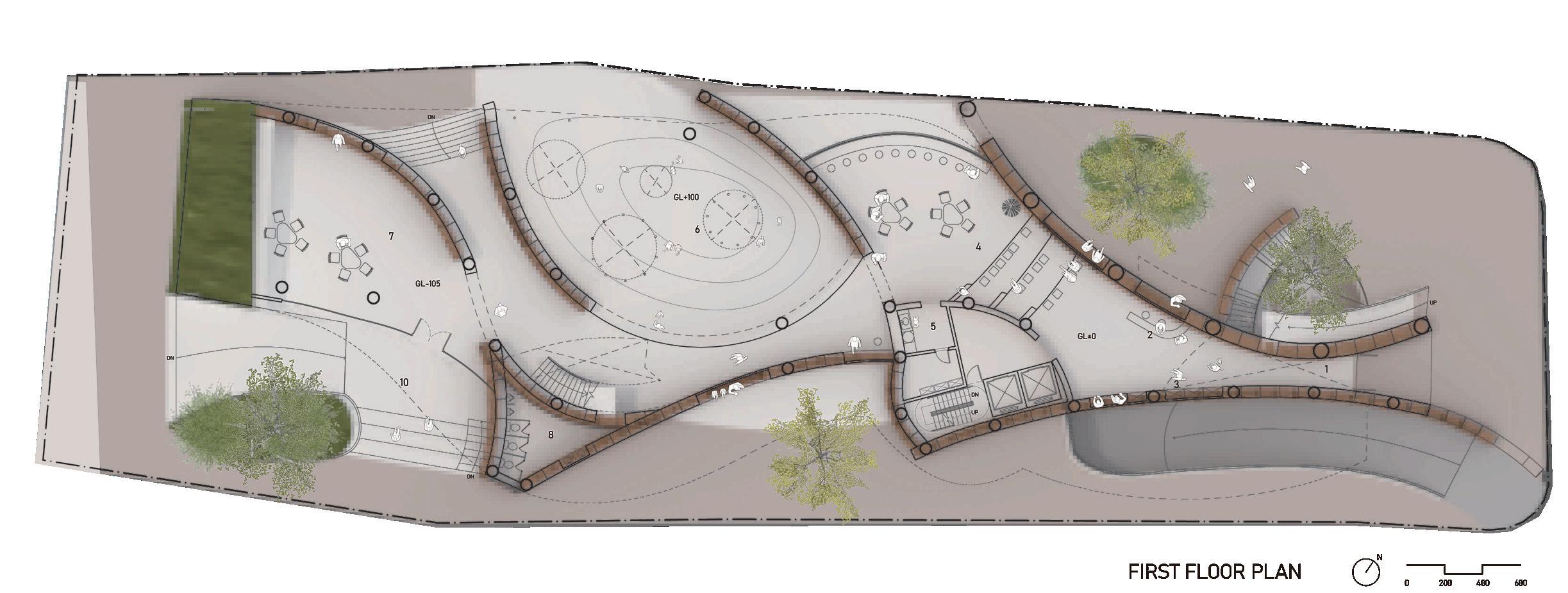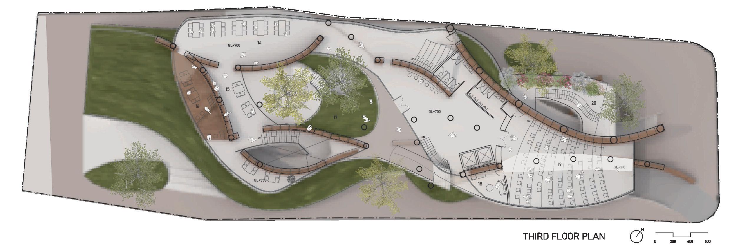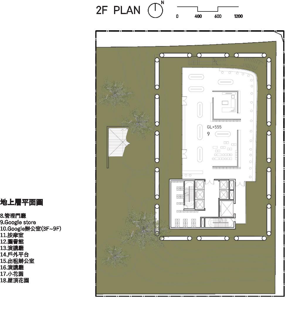 14.青少年閱讀空間 15.觀河閱讀空間 16.中庭讀書空間 17.中庭 18.準備室 19.小演講廳 20.花園廊道 11.兒童閱覽空間暨幼兒區 12.小討論空間 13.戶外廊道 1.大門 2.櫃檯 3.儲物櫃 4.網路資訊區 5.茶水間 6.幼兒區 7.兒童閱覽空間 8.性別友善廁所 9.戶外廣場 10.下層廣場 A C A’ B’ D’ D B C’ 600 0 1200 1800 600 0 1200 1800 600 0 1200 1800