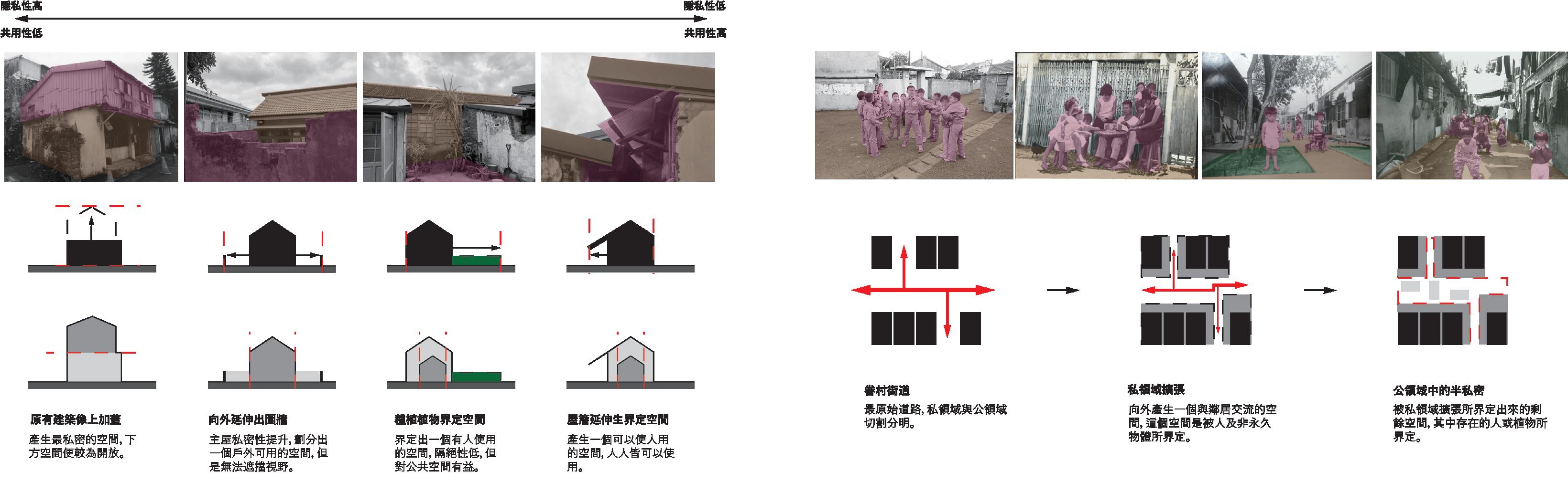 透過觀察以及分析,我發現眷村的生活模式是隨著人口的增加導致使用空間減少,為了增加 生活的使用空間而不斷擴張重疊,最終產生出街邊生活以及後院經濟等眷村生活型態的聚落 ,並且以這個概念設計出一個貫穿所有公共空間的眷村大街,將公共空間的效益最大化,並且 引導使用者走出家門或是在家門前與他人產生活動,使社區的關係可以進一步的提升,最後 透過立面的設計,使這些活動可以從立面就直接被閱讀,讓整體的建築變得更有生命力。