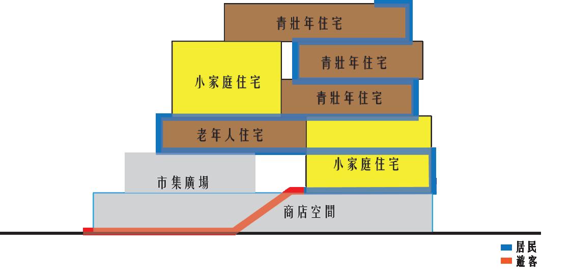 平面配置設計: 現代的社會和過往相比是比較隔閡的,人與人之間的距 離也擴張到一個前所未有的高度,我希望可以透過過往 眷村的生活模式來回歸人與人之間的人情味,因此我設 計了一個貫穿所有單元以及公設地眷村大街,然後並且 設計了可以打開的單元,讓活動產生在家門口或是街邊 ,打破現在社會的冷漠的同時確保個人空間的隱私性。