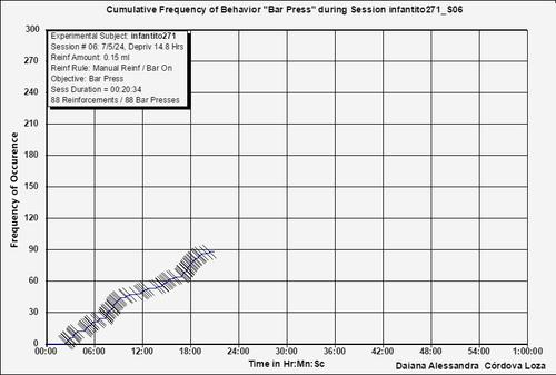 Durante la sesión 06 la rata “infantito271” recibió un total de 88 refuerzos, que está relacionada con la entrega de agua Posteriormente, la rata “infantito271” realizó un total de 88 presiones en la palanca, siendo considerada una respuesta condicionada que realiza esta, para obtener el refuerzo (agua)