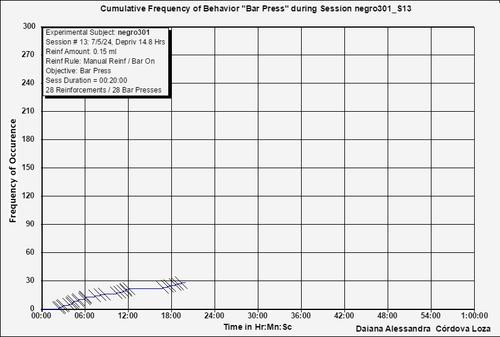 Durante la sesión 13 la rata “negro301” recibió un total de 28 refuerzos, que está relacionada con la entrega de agua Posteriormente, la rata “chebas271” realizó un total de 28 presiones en la palanca, siendo considerada una respuesta condicionada que realiza esta, para obtener el refuerzo (agua) Esto presentó un aumento notable en el número de presiones de palanca y refuerzos a lo largo de las sesiones