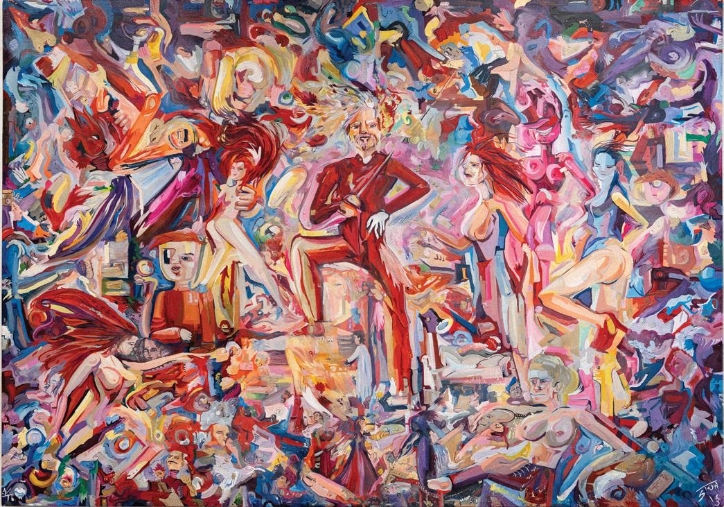Rather than write a formal answer, STO turned to his canvas. The result was “Temptations of The Power”, a bold visual meditation that combines ancient symbols, mythic archetypes, and intensely personal motifs. The piece is filled with esoteric language, imagery of light and shadow, and references to spiritual hierarchies. Angels, demons, sacred scripts, and emotional abstractions come together in a work that feels both timeless and deeply individual.