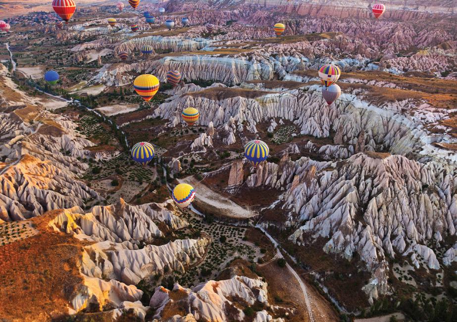 Drift above the surreal, moon-like landscape of Cappadocia in a hot air balloon, where fairy chimneys, ancient cave dwellings, and rolling valleys stretch as far as the eye can see. As the sun rises over this otherworldly terrain, hundreds of colourful balloons take flight, creating one of the most breathtaking sights on Earth.