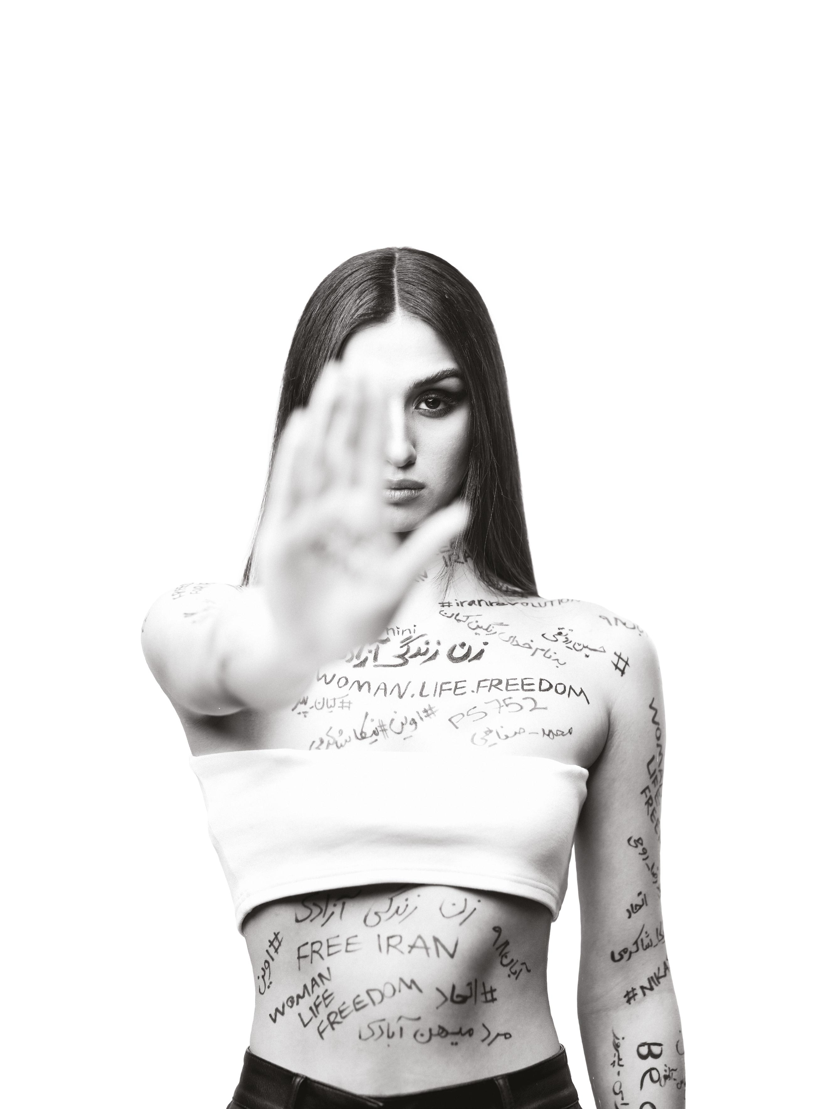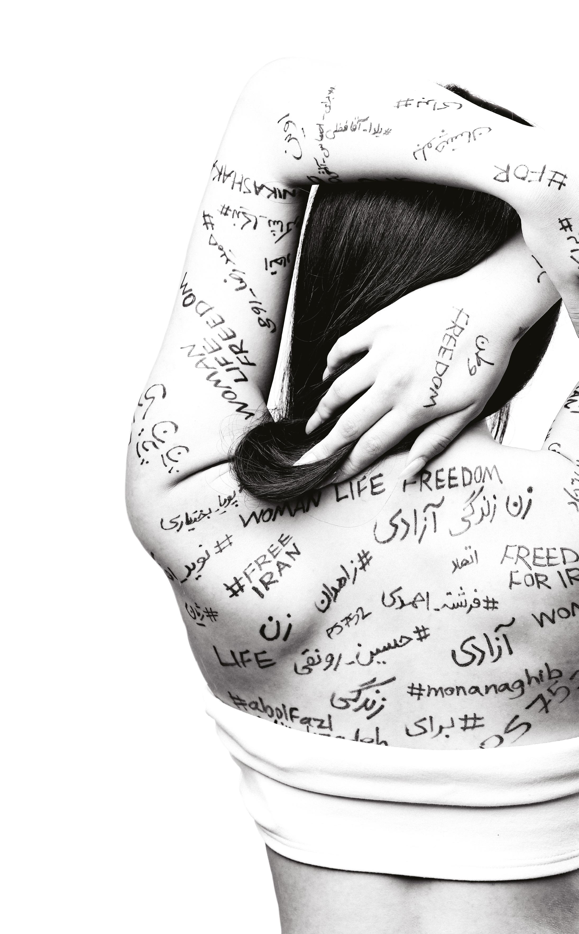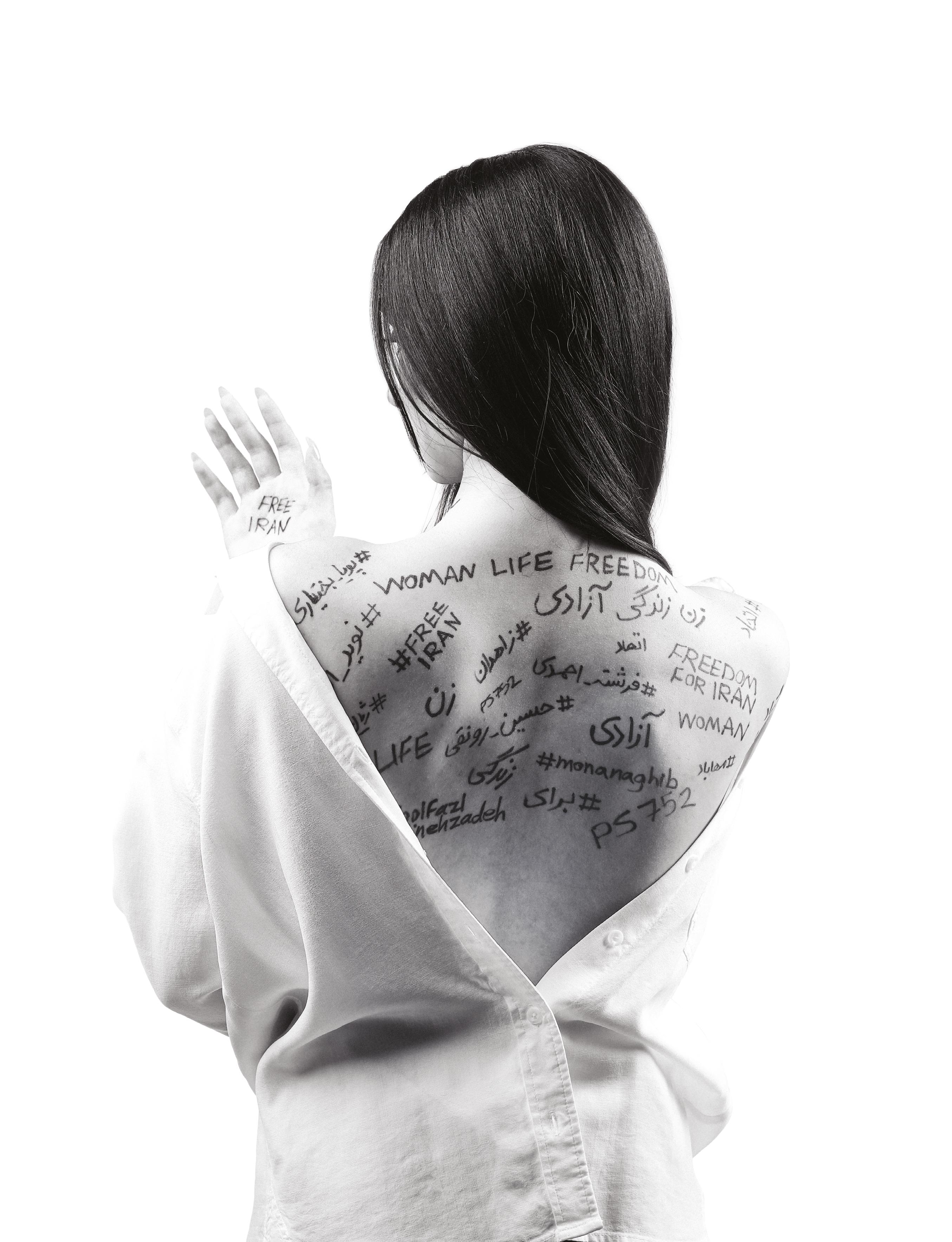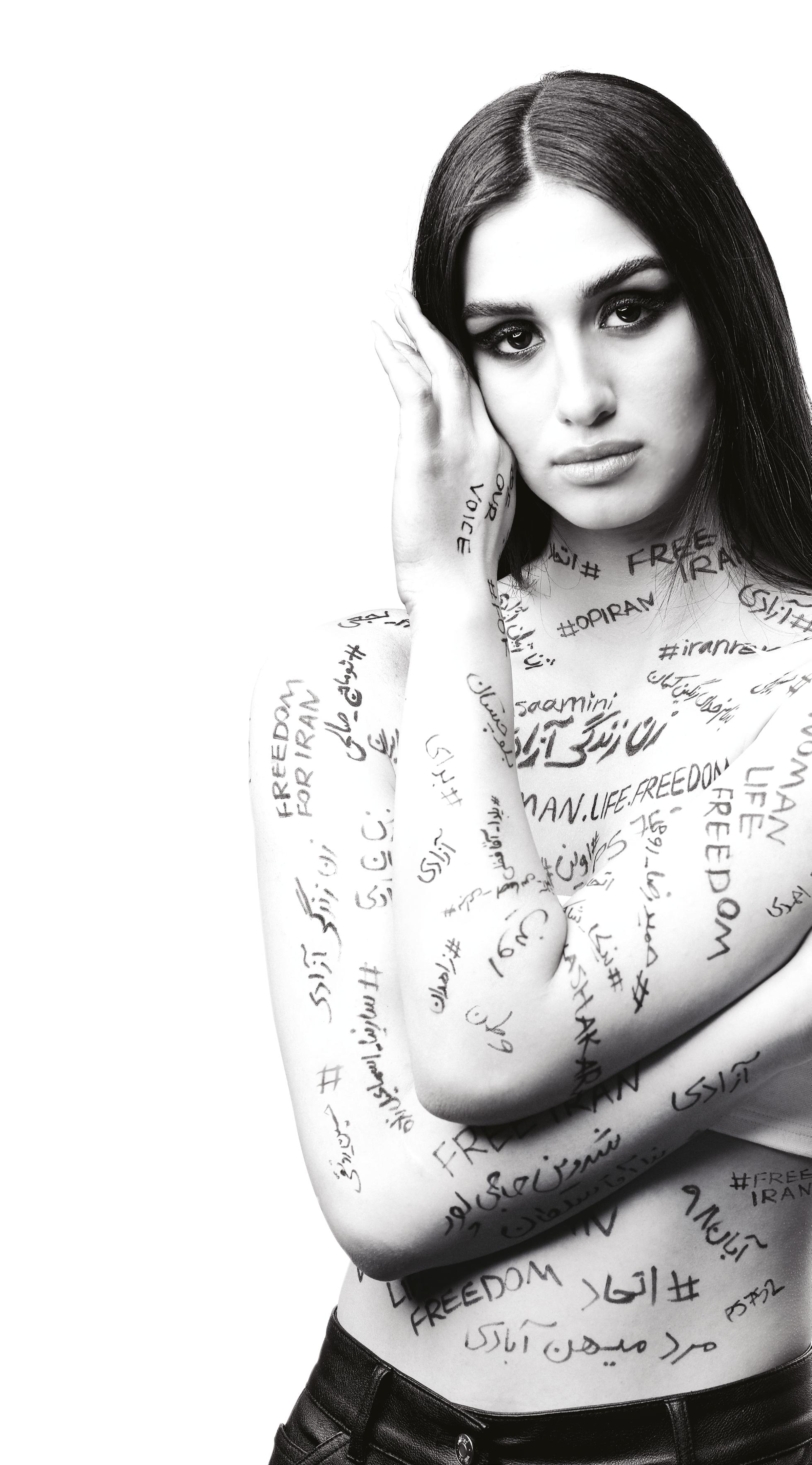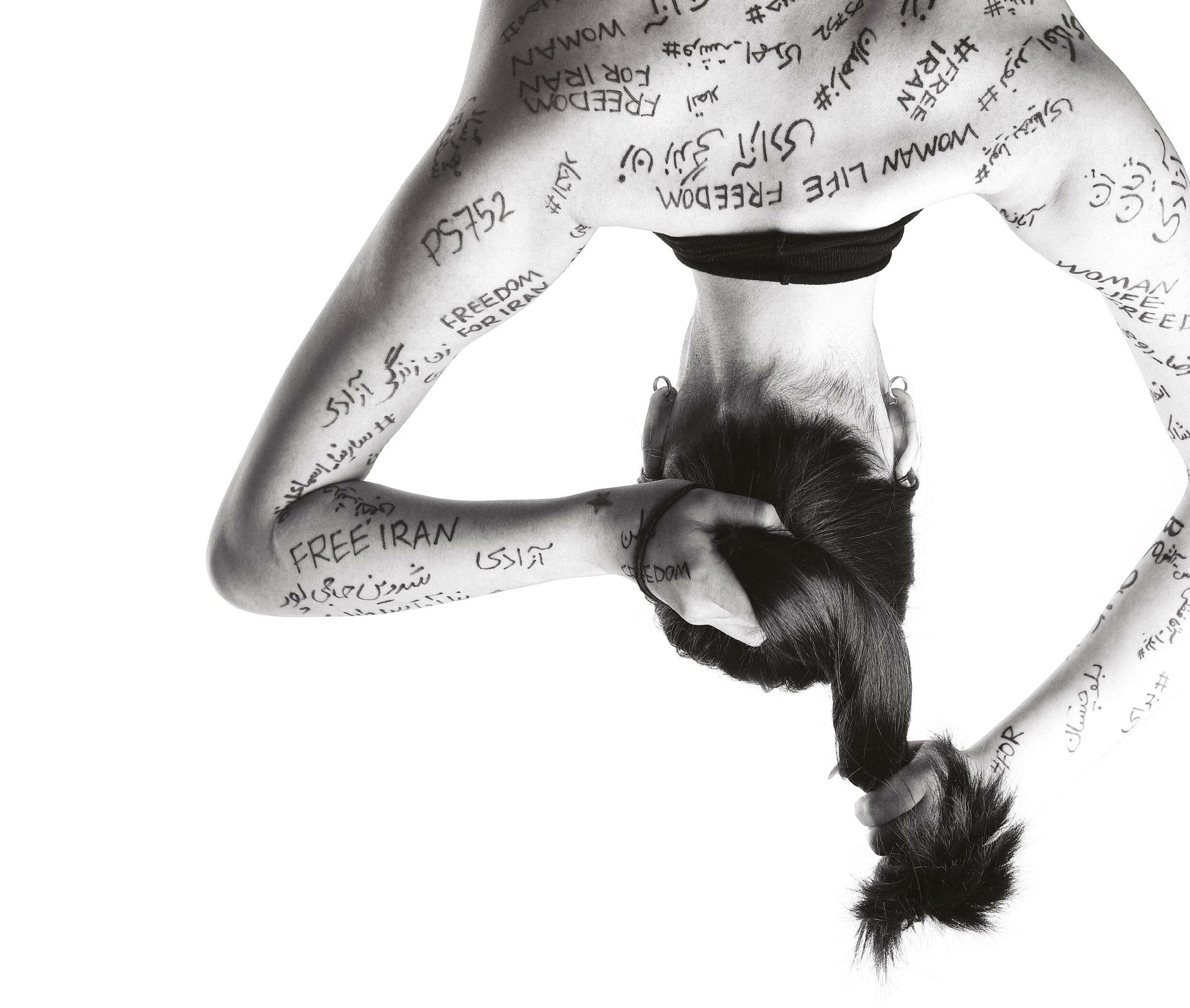 The body of the model is covered with some of the trending hashtags related to the recent revolutionary movement happening in Iran and are mostly the names of women, men and children who got killed by the brutal regime.