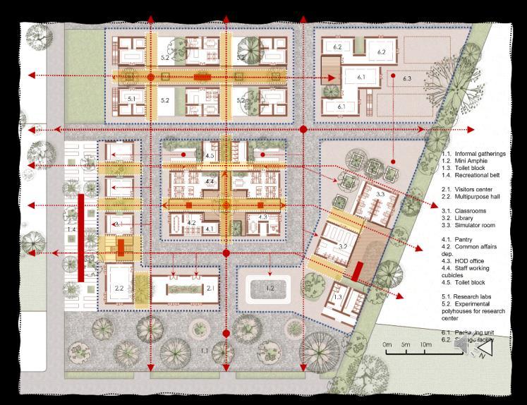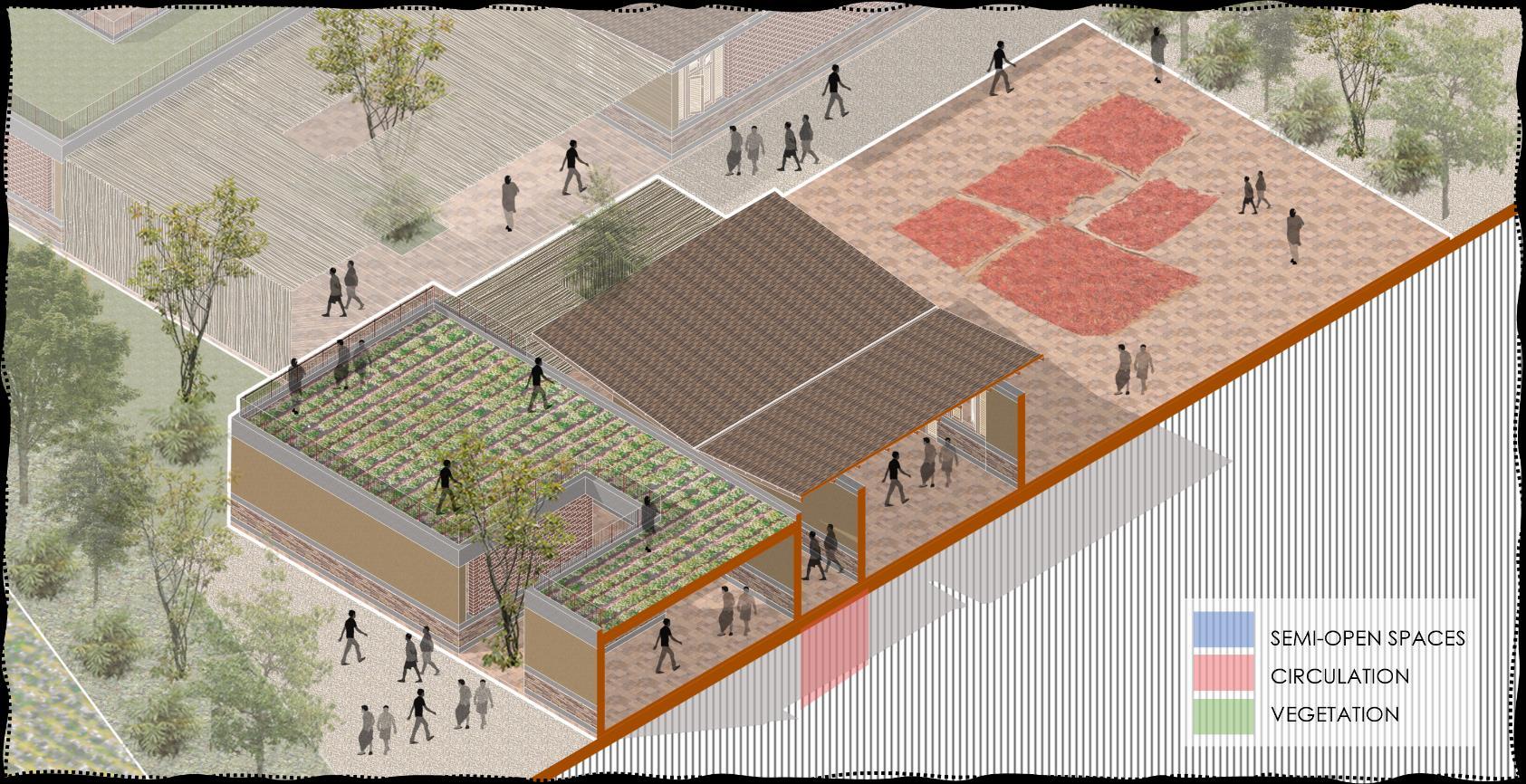 To achieve this, the concept is the integration of education and agriculture. A built environment intertwined with fields’ pattern creates different types of spaces and continuous surfaces. It connects functions, people, and vegetation. To do so, the entire project is divided into three fragments of 1. Upper class, 2. Middle class, 3. Lower class, which covers all three classes of farmers. For that, the program is divided according to different farming sections, according to affordability.