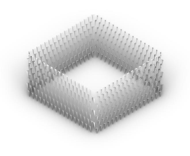 The pavilion seating, based on stacked cubes, is designed to facilitate group gatherings, fostering community interaction and shared experiences.