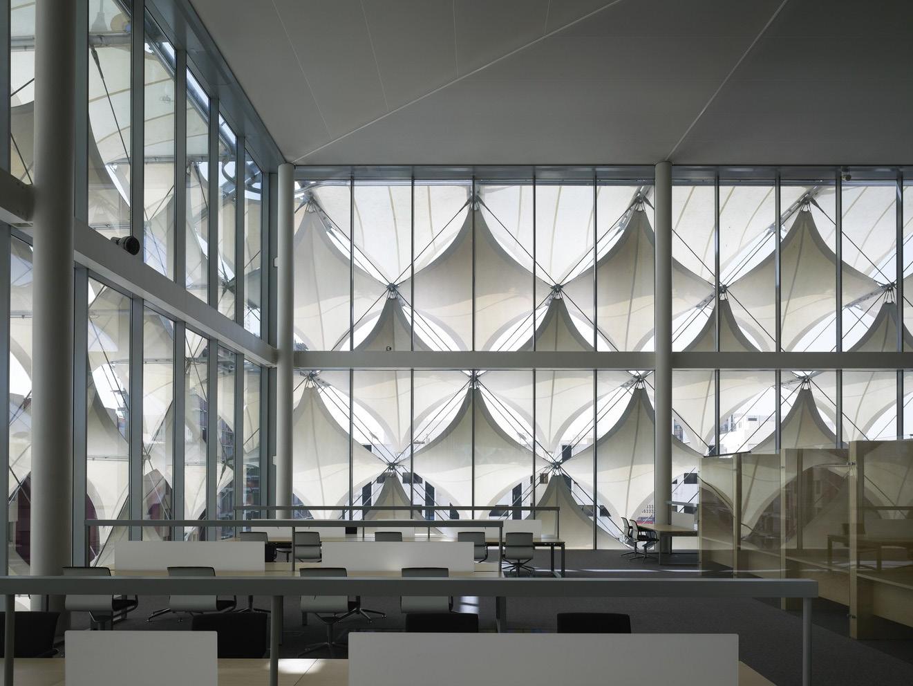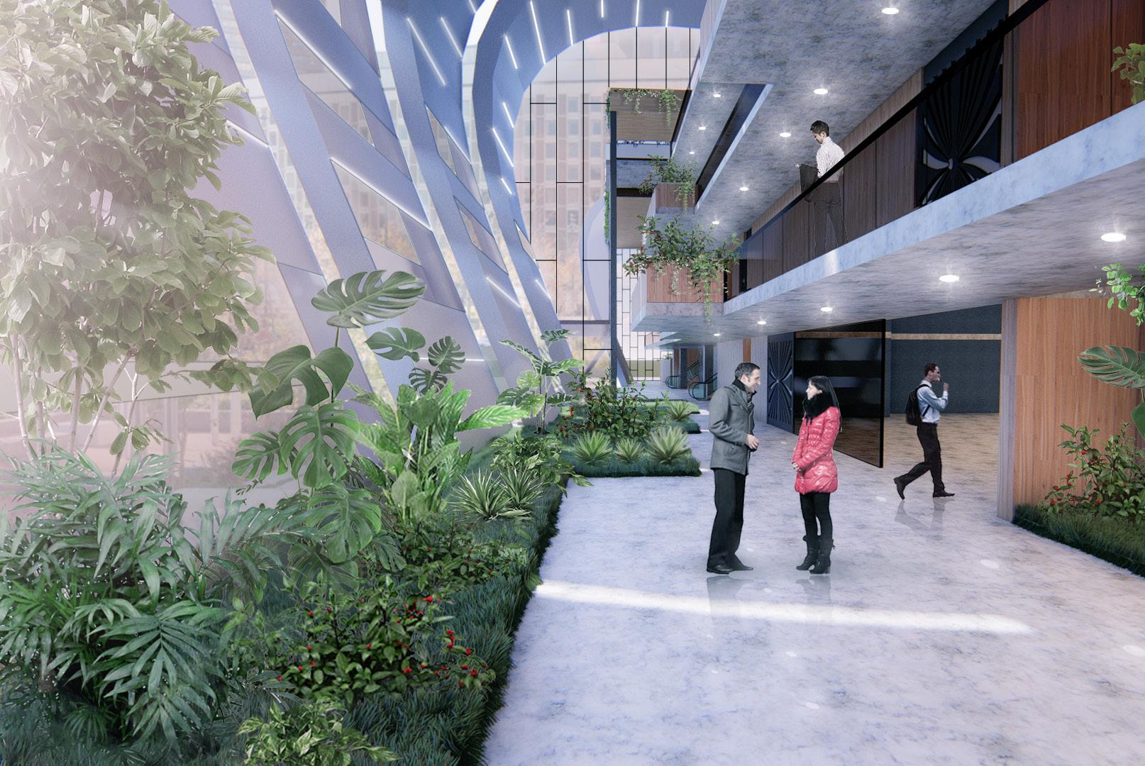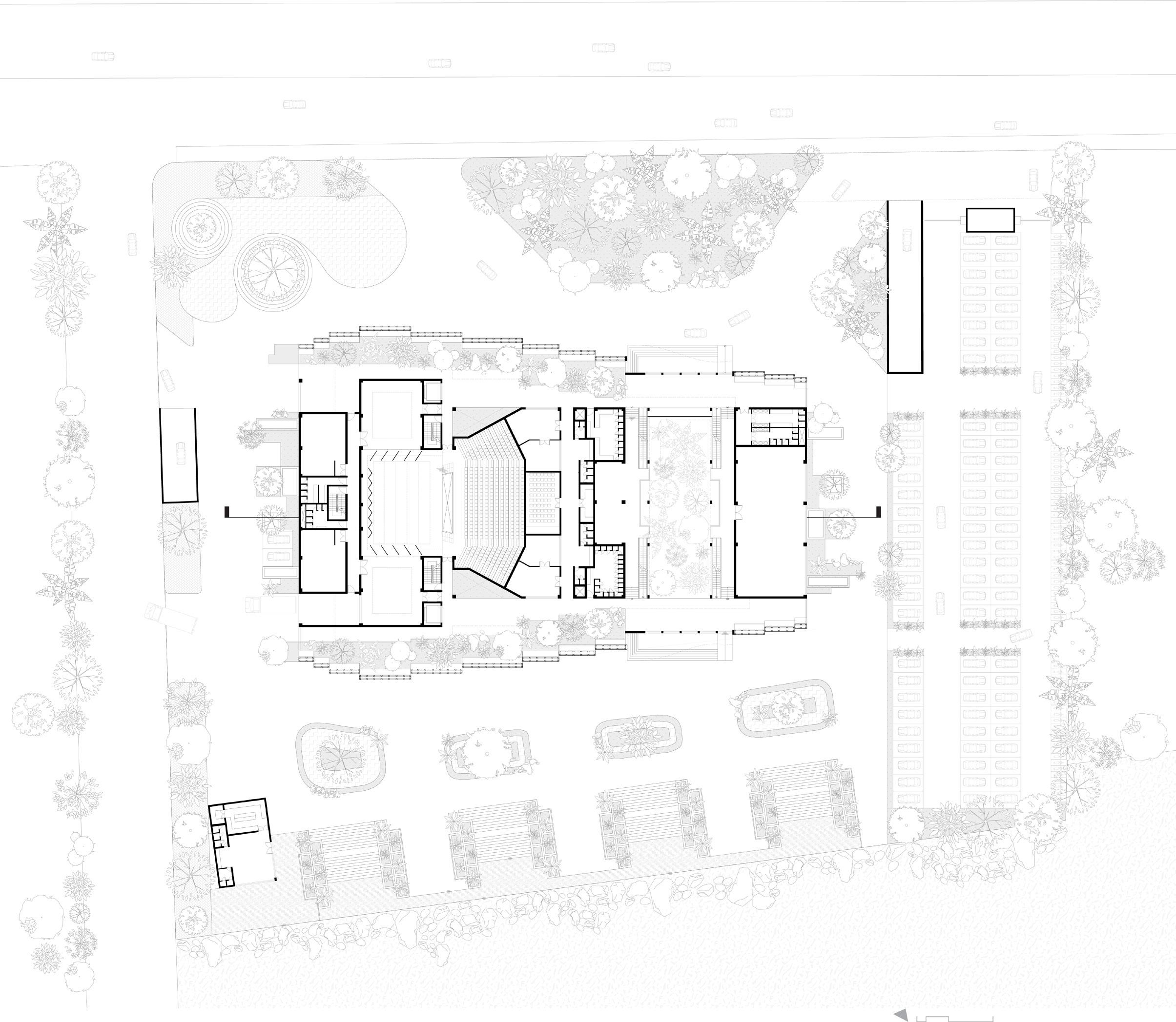The auditorium atrium, filled with lush greenery, separates the building into two parts and serves as a welcoming entrance. It seamlessly brings the vibrant outdoor landscape into the building, creating a serene and inviting atmosphere.
