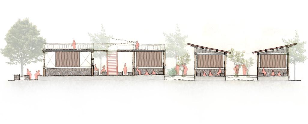 The pavilion features a halfcovered design with kinetic panels, allowing for fresh air circulation while providing openness yet enclosure. It creates a well-lit space ideal for winters, ensuring a comfortable and dynamic environment for all visitors.