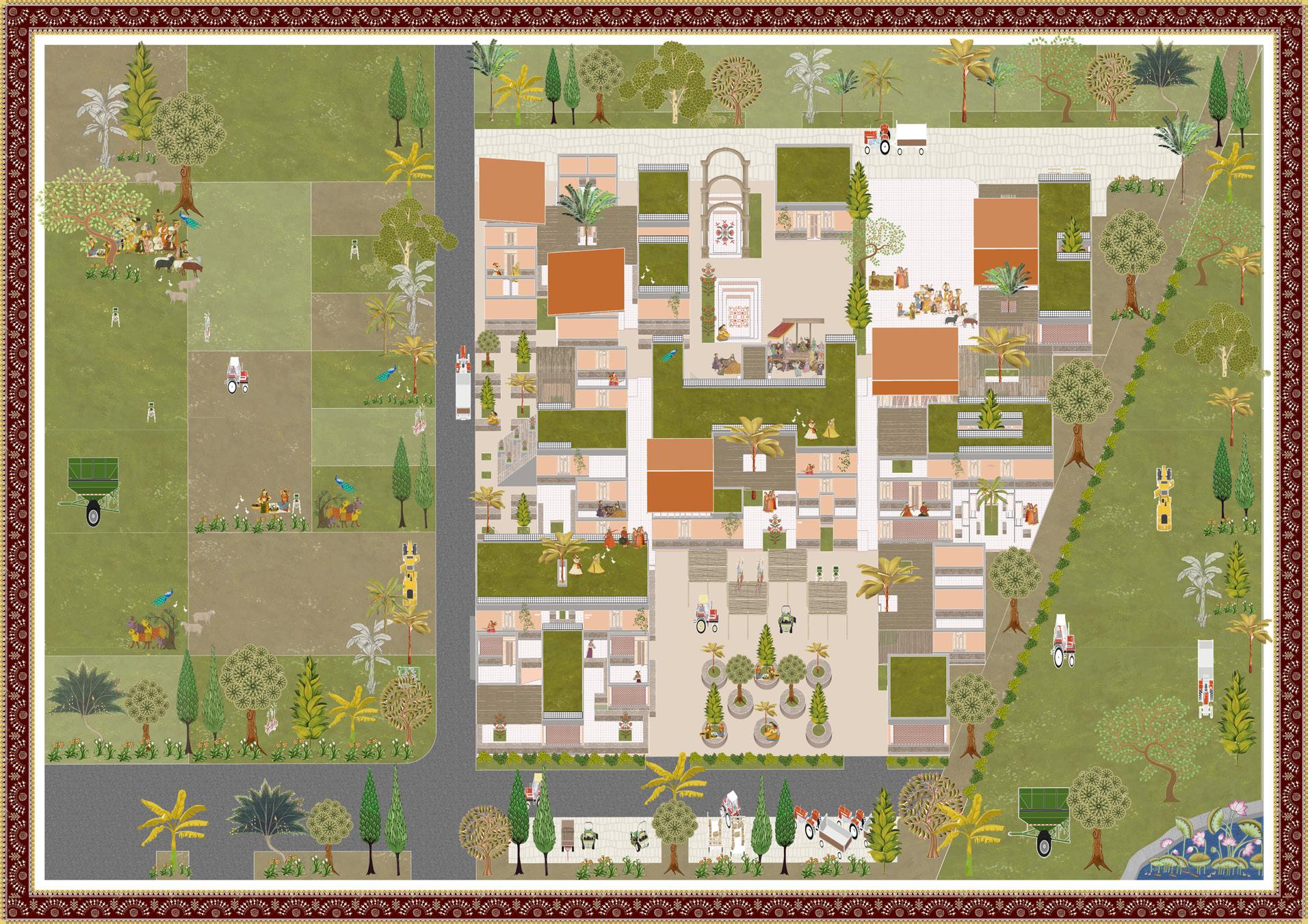 During the design development stage, the central placement of the Farmer’s Research Design Centre led to reduced space for essential agricultural elements such as farming land and polyhouses. This configuration also weakened the intended resemblance to the organic, decentralized structure of the local village fabric, which was a key conceptual driver. A reevaluation of the spatial hierarchy became necessary, shifting focus from institutional centrality to a more balanced integration of built and unbuilt spaces. This adjustment emphasized the importance of aligning spatial planning with conceptual intent and highlighted the value of iteration in achieving contextual and functional coherence.
