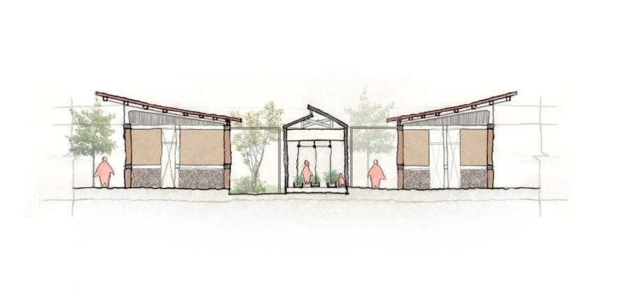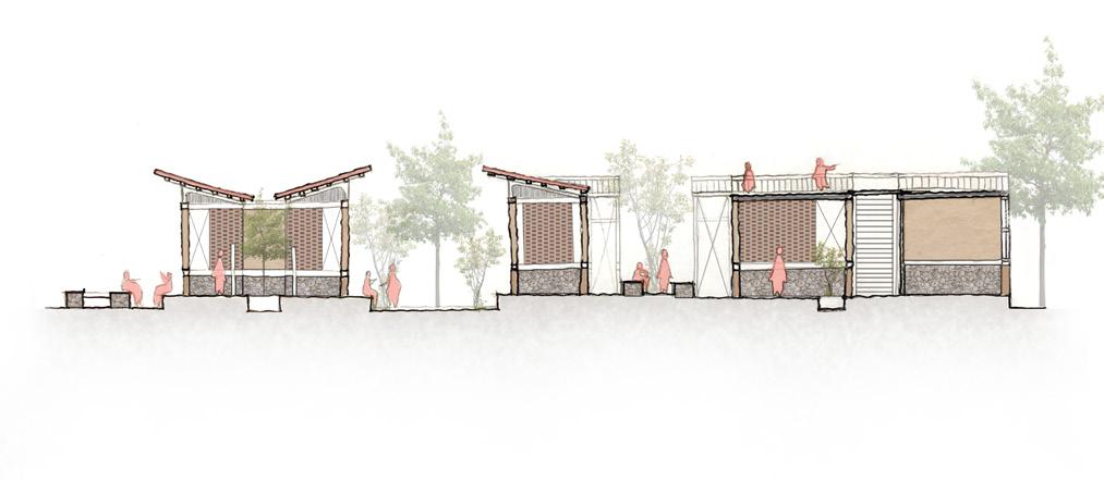 The design concept focuses on fostering interaction through the creation of multiple shared spaces. Built units are strategically staggered to form interstitial “stitching spaces” that serve as informal gathering zones. These spaces are enhanced with eucalyptus pergola structures and integrated seating to encourage social engagement and relaxation. At the master plan level, the layout draws inspiration from the identity of a local village, incorporating a grid-based planning approach that ensures functional connectivity between the research centre and surrounding farming lands.