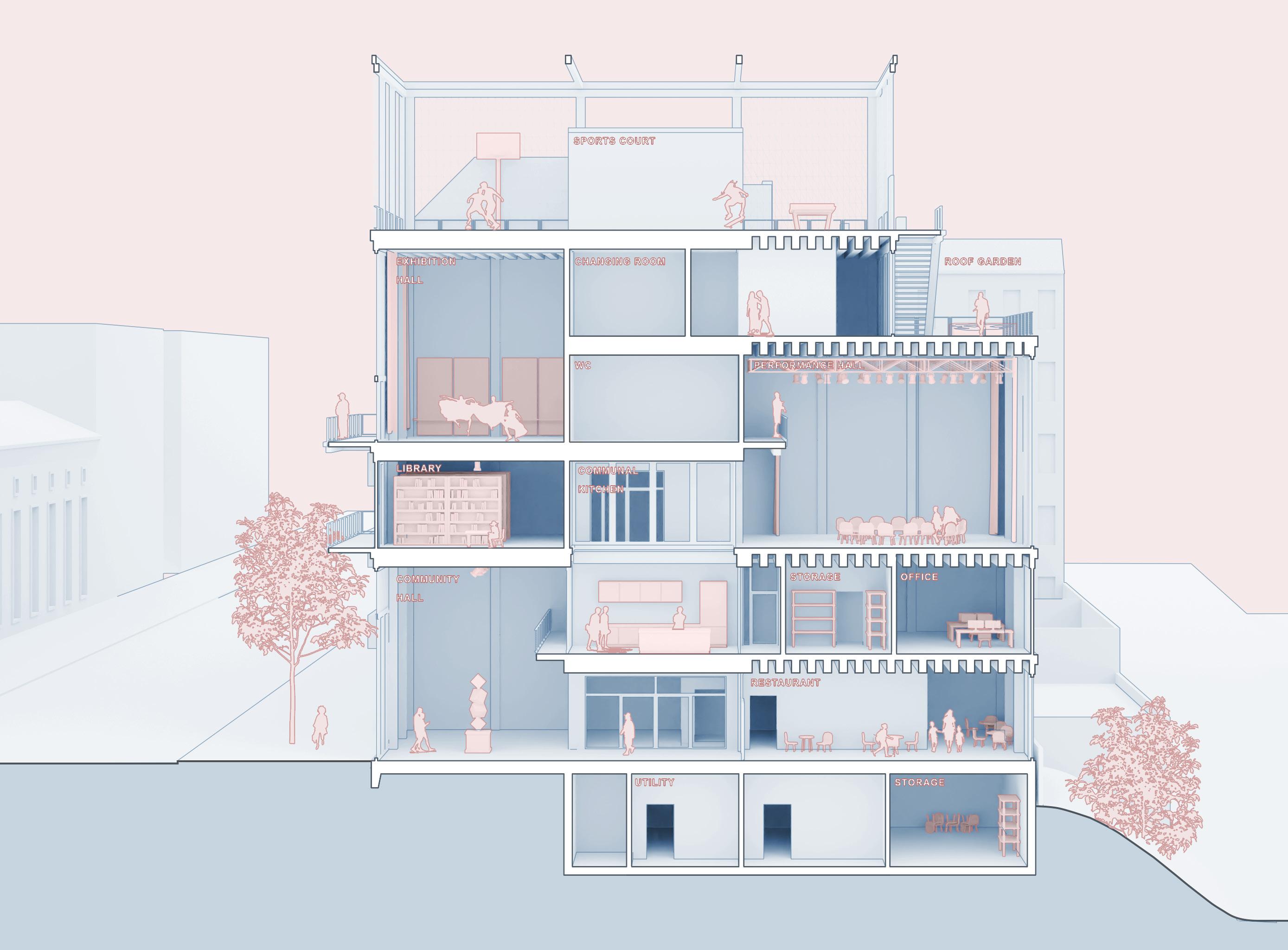 The existing grid is then perturbed by two means of circulation. Internally, through a core, and externally on balconies.Instead of having one central performance room. Several attractive and individual spaces are inserted into the grid.
