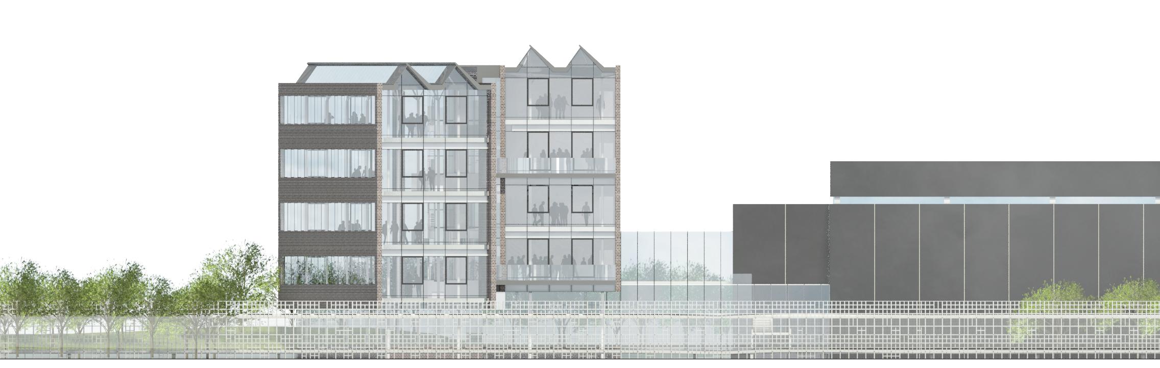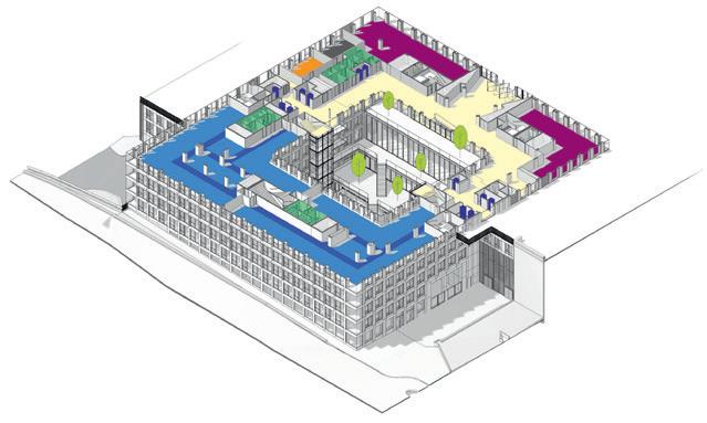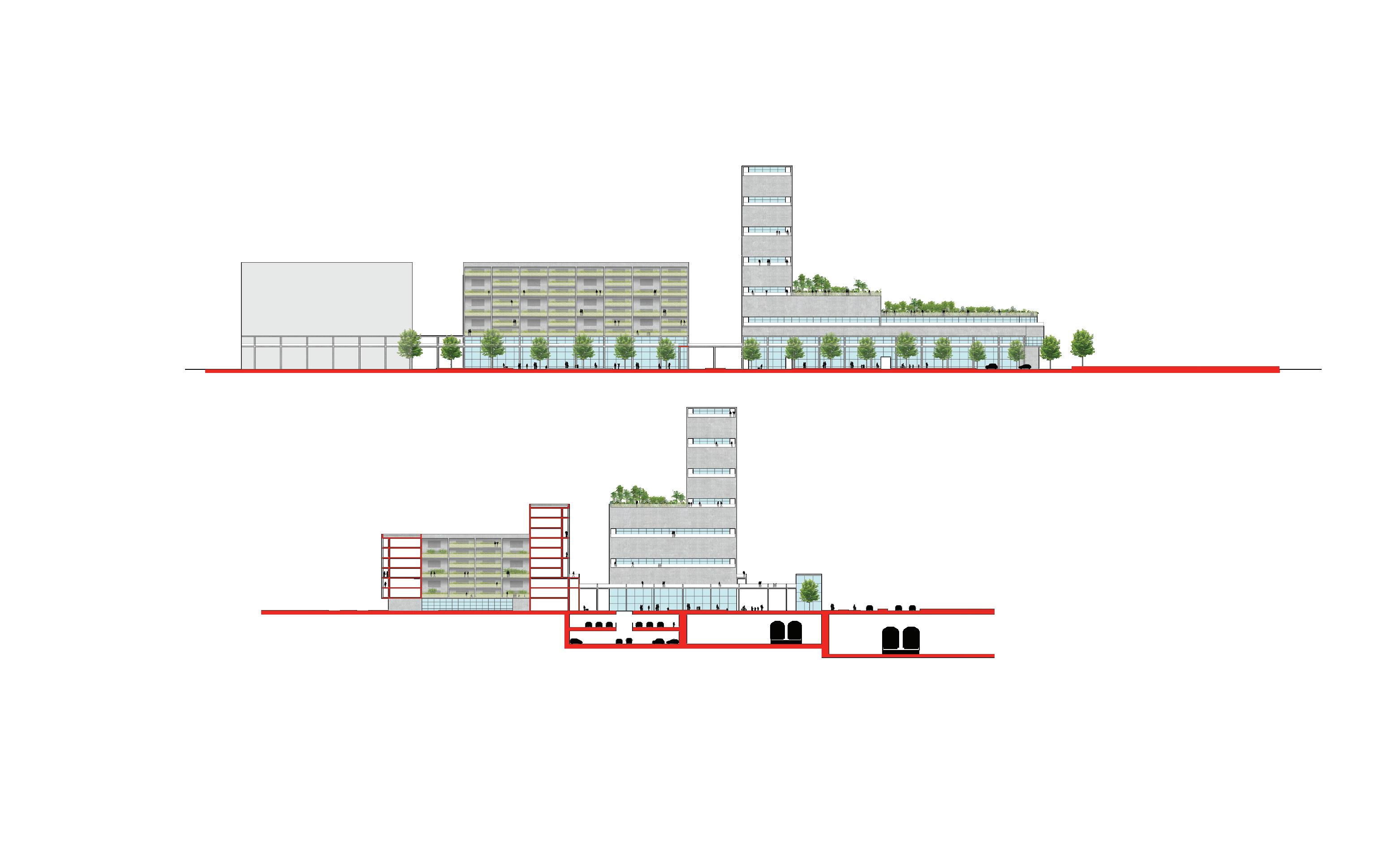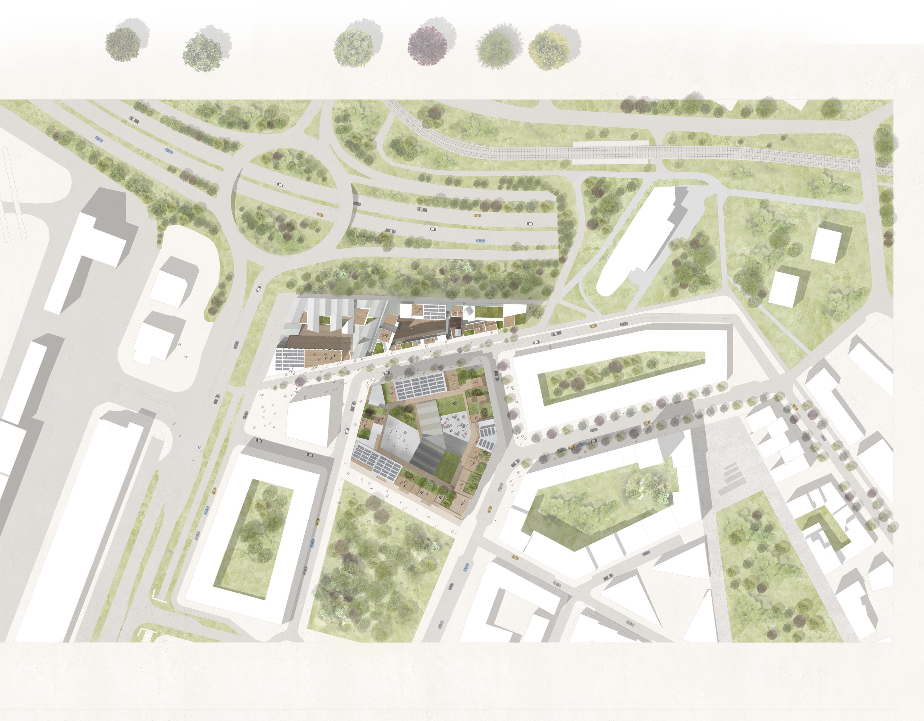 Au nord, un deuxième bloc urbain triangulaire, plus polyvalent, comprend des résidences étudiantes, un parking sur plusieurs étages, des bureaux et un centre sportif aux étages supérieurs.